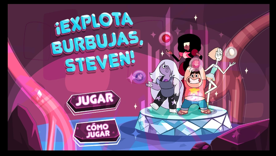 ""¡Explota Burbujas, Steven!" es un divertidísimo juego de Cartoon Network. Usando tus personajes favoritos de Steven Universe, dispara tus burbujas de gemas de cristal y hazlas coincidir con burbujas del mismo tipo para reventarlas. Si llenas todo el espacio o si una de tus burbujas cae a la lava, pierdes."[1]