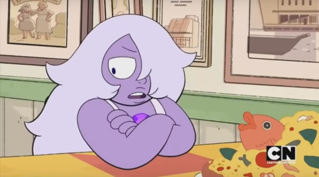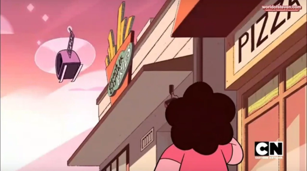 Finalmente Amatista y Steven terminan en Fish Stew Pizza, donde le ponen una pizza con todos los ingredientes. Mientras, charlan con respecto a que Rose Cuarzo es Diamante Rosa, y Steven confiesa estar confundido al respecto. Jenny entra al local y dice que Greg estaba charlando con una pequeña amiga realmente roja. Steven y Amatista intuyeron que se trataba de Rubí, así que salieron del local para ir en su búsqueda.