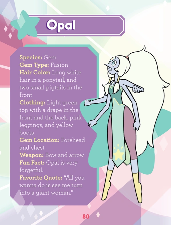 Ópalo es la segunda fusión en aparecer en la serie, siendo la primera Garnet.