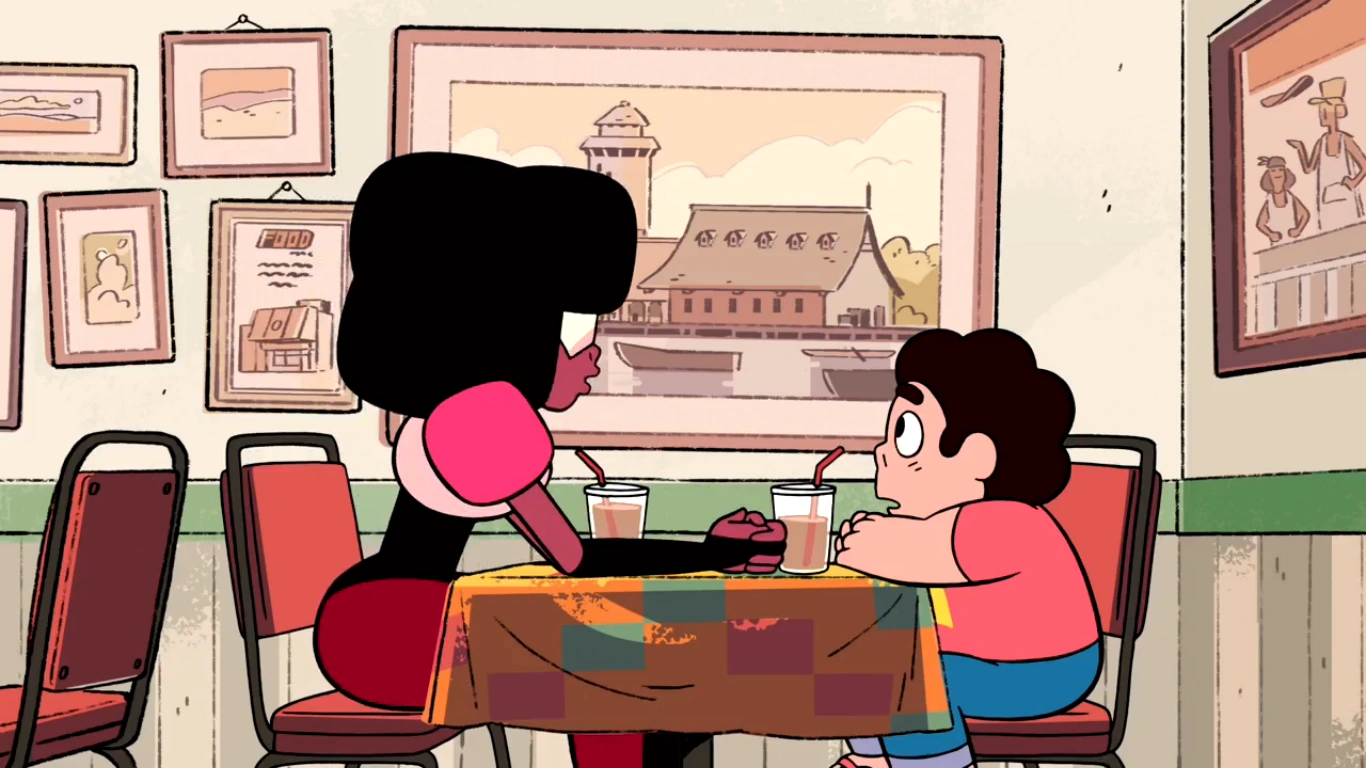 - Cuando Garnet cruzó los brazos en la pizzería, el dedo medio de su mano no estaba coloreado. Esto se soluciona cuando la escena cambia.
