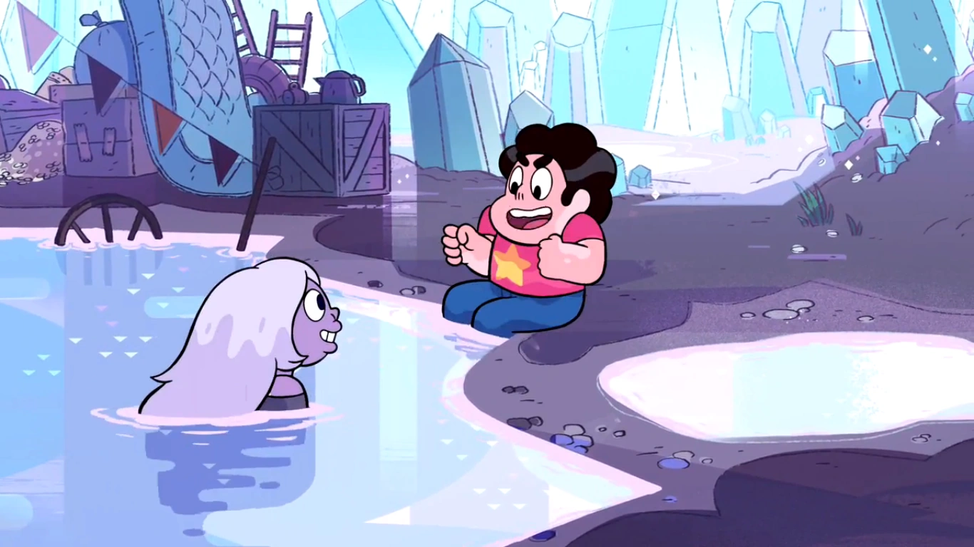 pregunta si dolerá, Amatista le demuestra a que se refería saltando y convirtiéndose en una bola a la vez. Amatista le muestra a Steven que puede saltar en otros charcos, Steven mira en uno y sumerge su cabeza, de repente se encuentra en el cuarto de fundición mientras Garnet trae de vuelta una Gema encapsulada. Amatista saca a Steven del charco y le dice que solo Garnet puede estar allí. Amatista le sugiere a Steven subir a una pila de objetos y saltar a otro charco que lo llevara hacia otro lugar.