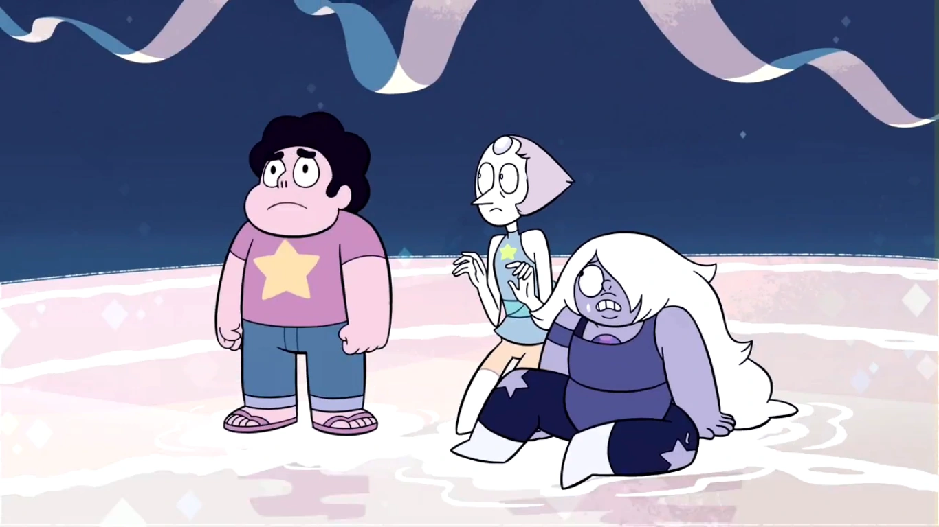 - Cuando Garnet suelta a Amatista y Perla, estas caen a la derecha e izquierda de Steven, pero al minuto 10:46 cambian de posición.