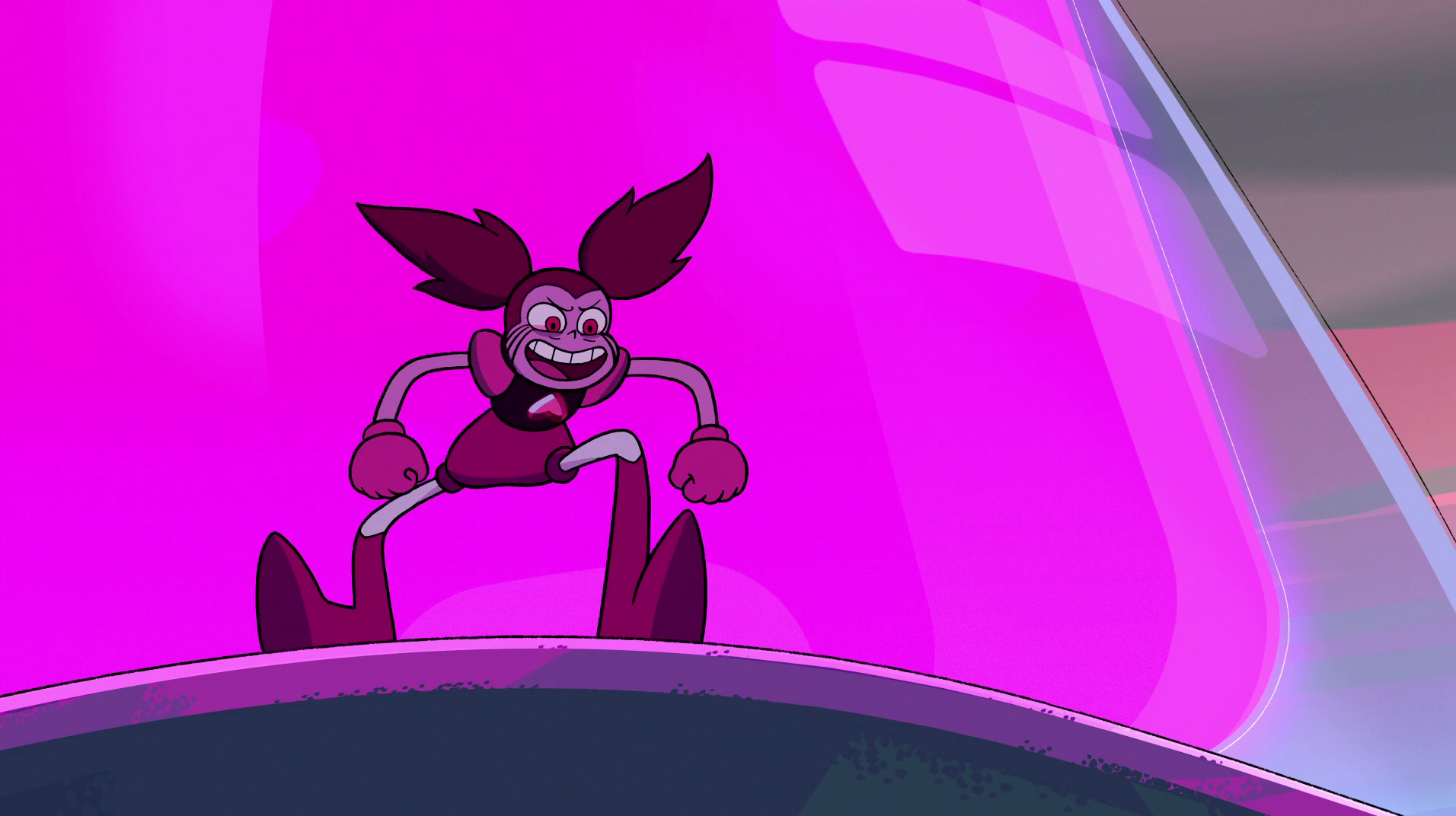 Luego, el día de la emisión final de Steven en el Planeta Madre antes de volver a la Tierra, Espinela llega a Ciudad Playa en un personalizado inyector masivo el cual ella utiliza para llenar el planeta con veneno. Espinela empieza a luchar contra Garnet, Amatista y Perla, su habilidad de elasticidad y su método caótico de movimiento le permitió derrotarlas fácilmente con su rejuvenecedor. Furioso, Steven logra tomar control de su arma y evapora a Espinela con ella.