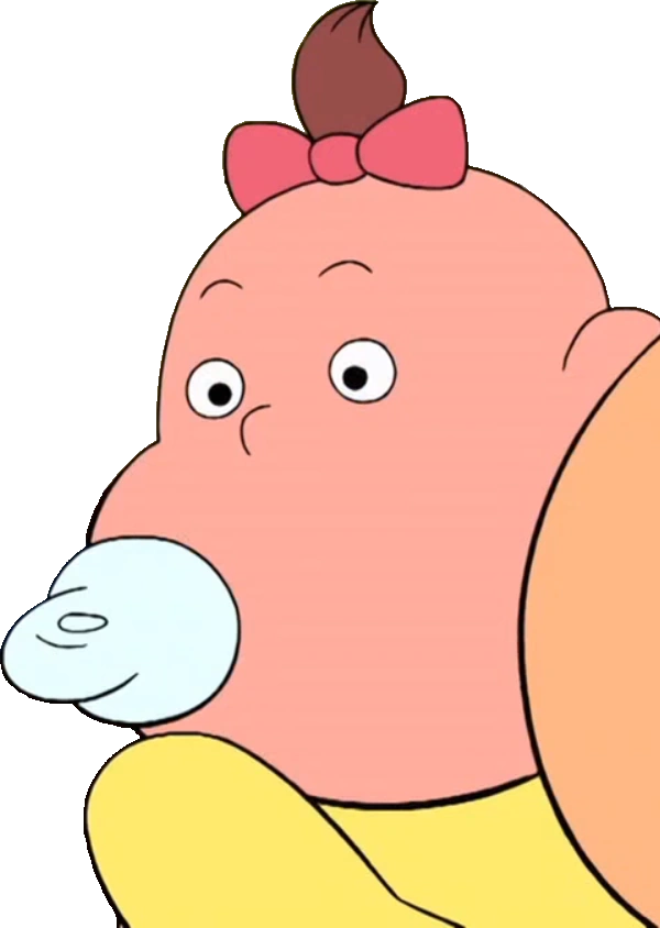 Tiene una piel clara, cabello marrón amarrado con un lazo moño rosado, un mameluco color amarillo y un chupón celeste.