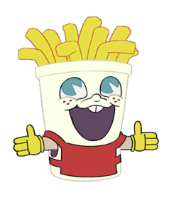 Su diseño hace alusión al estilo de caricaturas de los años 40. Su cuerpo es similar a un vaso de bebida con una cara sonriente. Tiene guantes amarillos y un delantal rojo. Sus pupilas son de color celeste algo grisáceo, su cabello son papas fritas un poco dañadas por las aves. Tiene tres pecas en ambas mejillas.