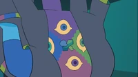 Es una mano gigante cuyos "dedos" se tratan de varias extremidades; en la "muñeca" cuenta con otras extremidades más. Cuenta con cuatro ojos en su "palma". Sus colores son morado, rojo, verde, amarillo y azul. Está envuelta en una tela marrón. | Su piedra preciosa son fragmentos de gemas unidos color azul, morado, verde y amarillo. |