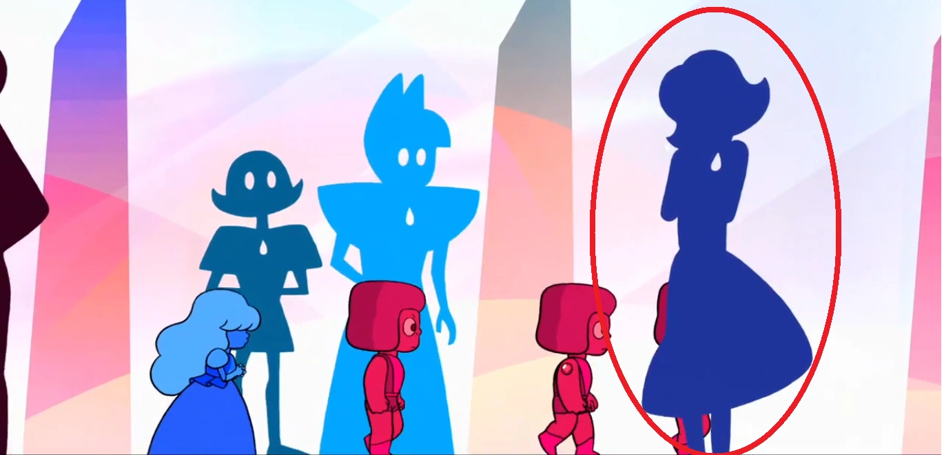 - En "La Respuesta", se ve una gema muy parecida a ella entre las siluetas coloreadas de fondo.