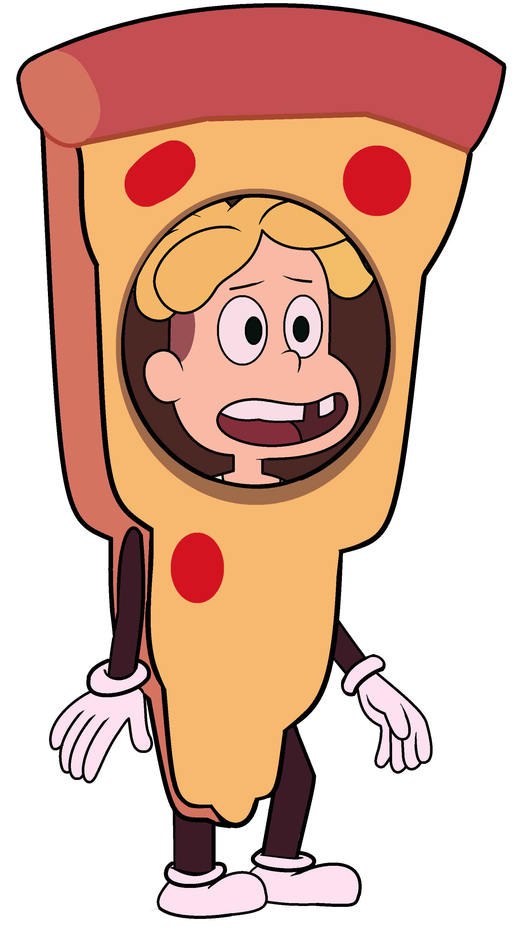 Peedee tiene el cabello rubio y ondulado de forma que parece un montón de papas fritas. Lleva unos tirantes blancos, unos vaqueros de color beige y sandalias amarillas. Además, le falta un diente.