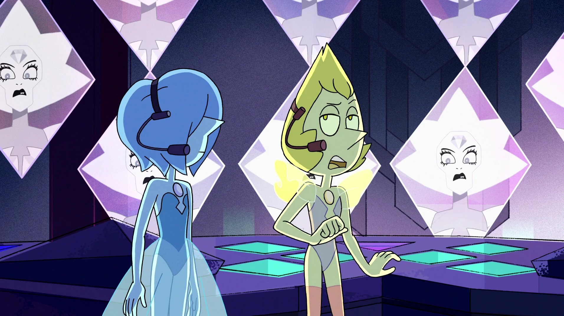 En "Familiar", Perla Azul lo trató con respeto ya que lo veía como Diamante Rosa. Más tarde, en "Juntos Solos", Steven les preguntó a Perla Amarilla y a ella qué les gustaba hacer, relevándole esta última que le gustaba dibujar.