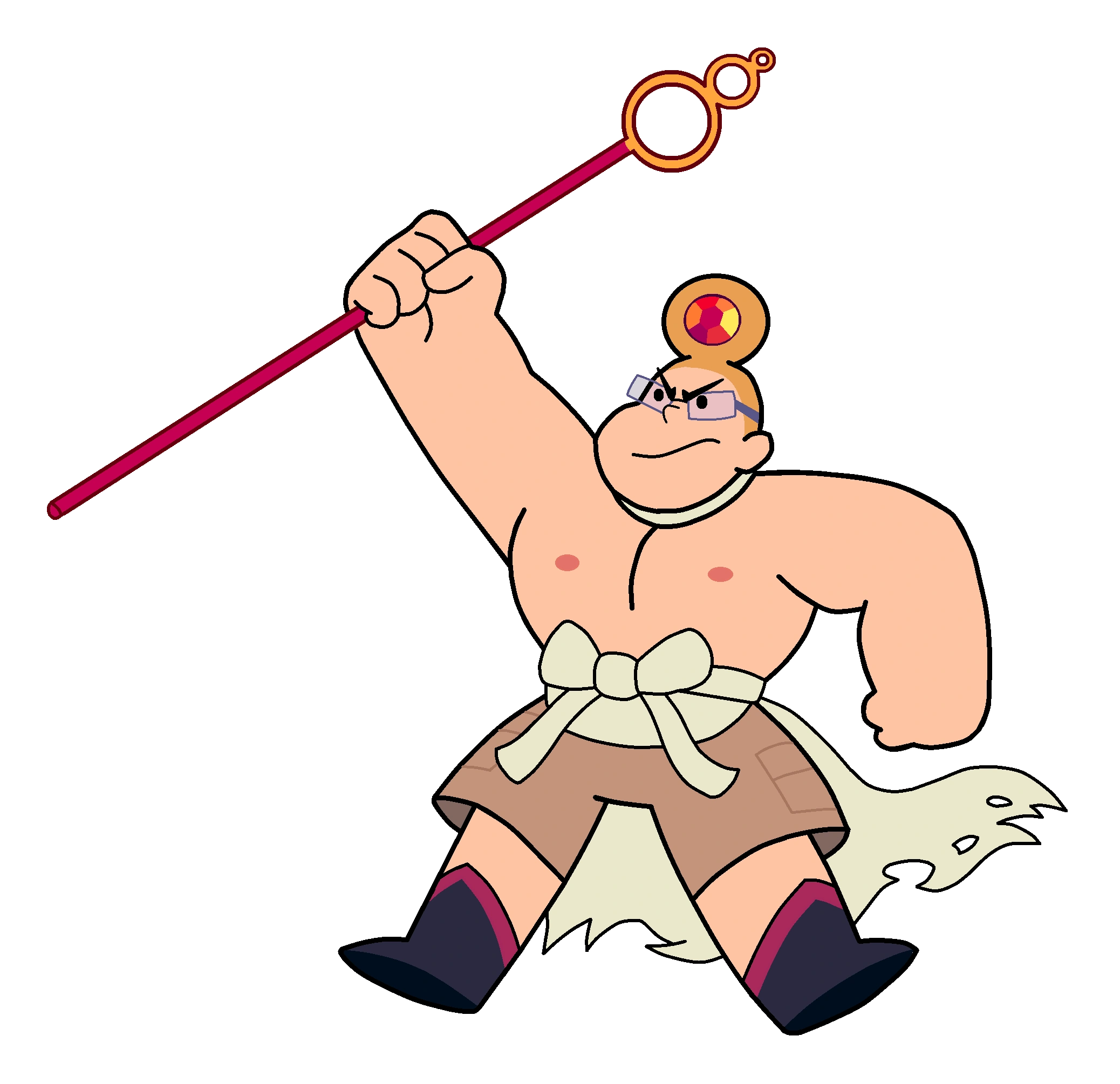 Antes de obtener la gema que le otorga poderes es prácticamente idéntico a Ronaldo. Su cabello se asemeja a un anillo. Viste un kimono color vino, pantalones cortos de color marrón, un delantal blanco, botas negras y gafas grises en forma de rectángulo. Después de colocar la joya en el bucle de su cabello se transforma, haciéndose más grande, fuerte y musculoso. Posterior a esto, sigue conservando sus gafas y pantalones cortos de color marrón, pero su kimono se pierde dejando al descubierto su pecho desnudo, sus botas cambian a una forma triangular con bordes de color bermellón y el delantal se invierte y adquiere desgaste. A mitad del episodio y al final del mismo lleva puesta ropa interior muy similar a la que lleva un luchador de sumo.