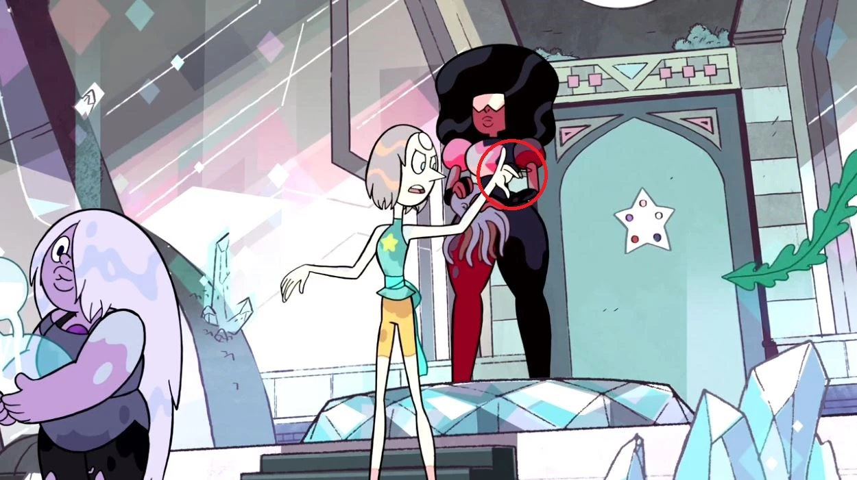 - Garnet estira su brazo para tomar a Steven. Esto lo explica Perla en "Dedos de Gato", cuando le dice a Steven que las Crystal Gems pueden modificar partes del cuerpo.
