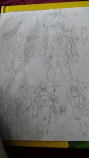 I know that I suck at drawing, Left to right: Steven + Peridot: Dirty Quartz, Amethyst + Jasper: Ametrine, Steven + Centpeetle/Trapiche: Grassy Quartz, Bismuth + Jasper: Cacoxenite, Peridot + Apatite(Gemsona): Vauxite.