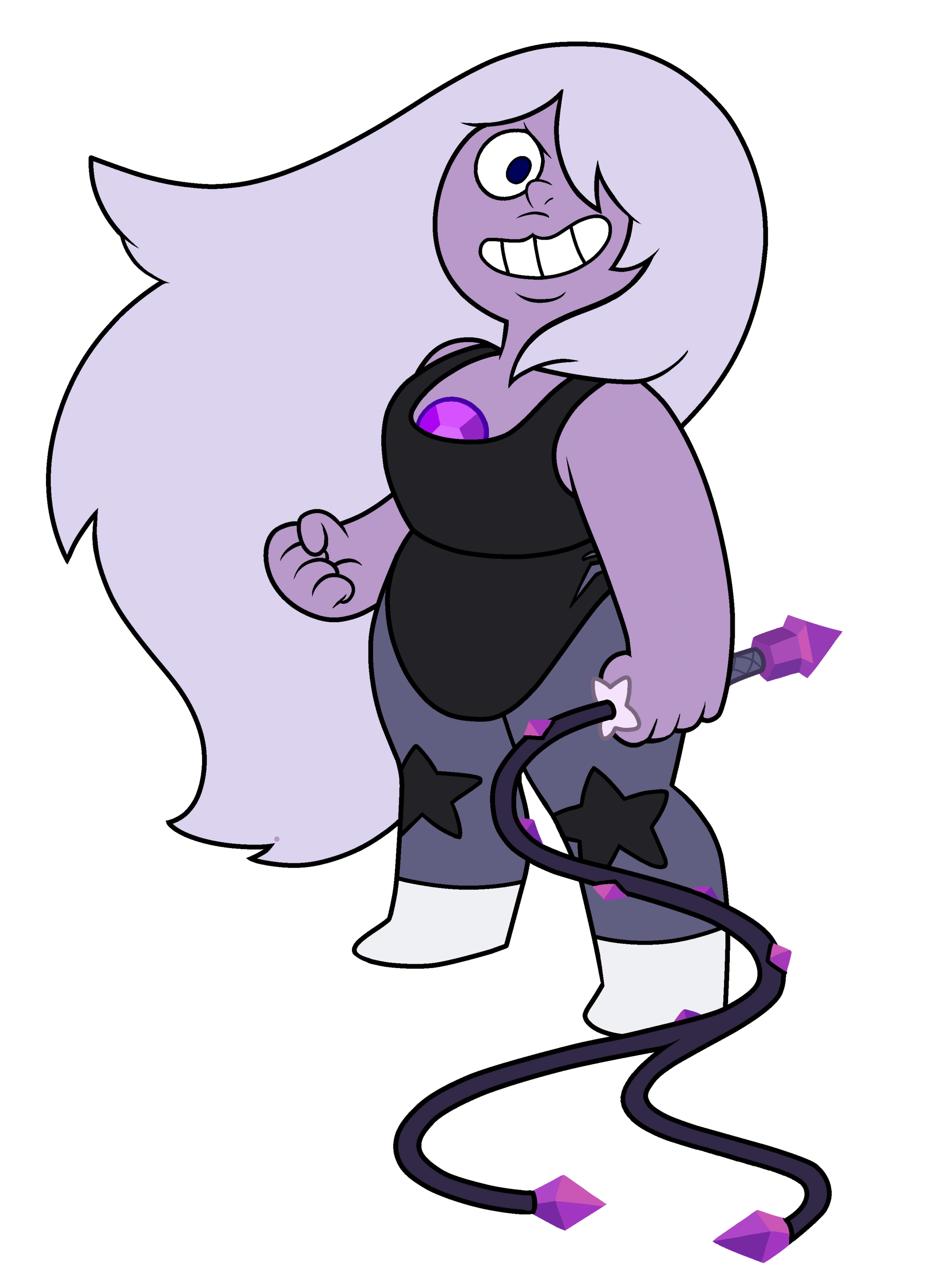 - Invocation d'arme : Tout comme les autres Gemmes, Améthyste a le pouvoir d'invoquer sa propre arme à partir de sa gemme placée sur sa poitrine. Son arme est un fouet violet avec des épines violettes. Elle s'en sert pour attaquer à distance ou pour saisir des projectiles à lancer sur son adversaire. Tout comme Perle avec ses lances, Améthyste peut se servir de plusieurs fouets à la fois. Elle peut aussi enflammer ses fouets pour donner plus de puissance à son attaque.