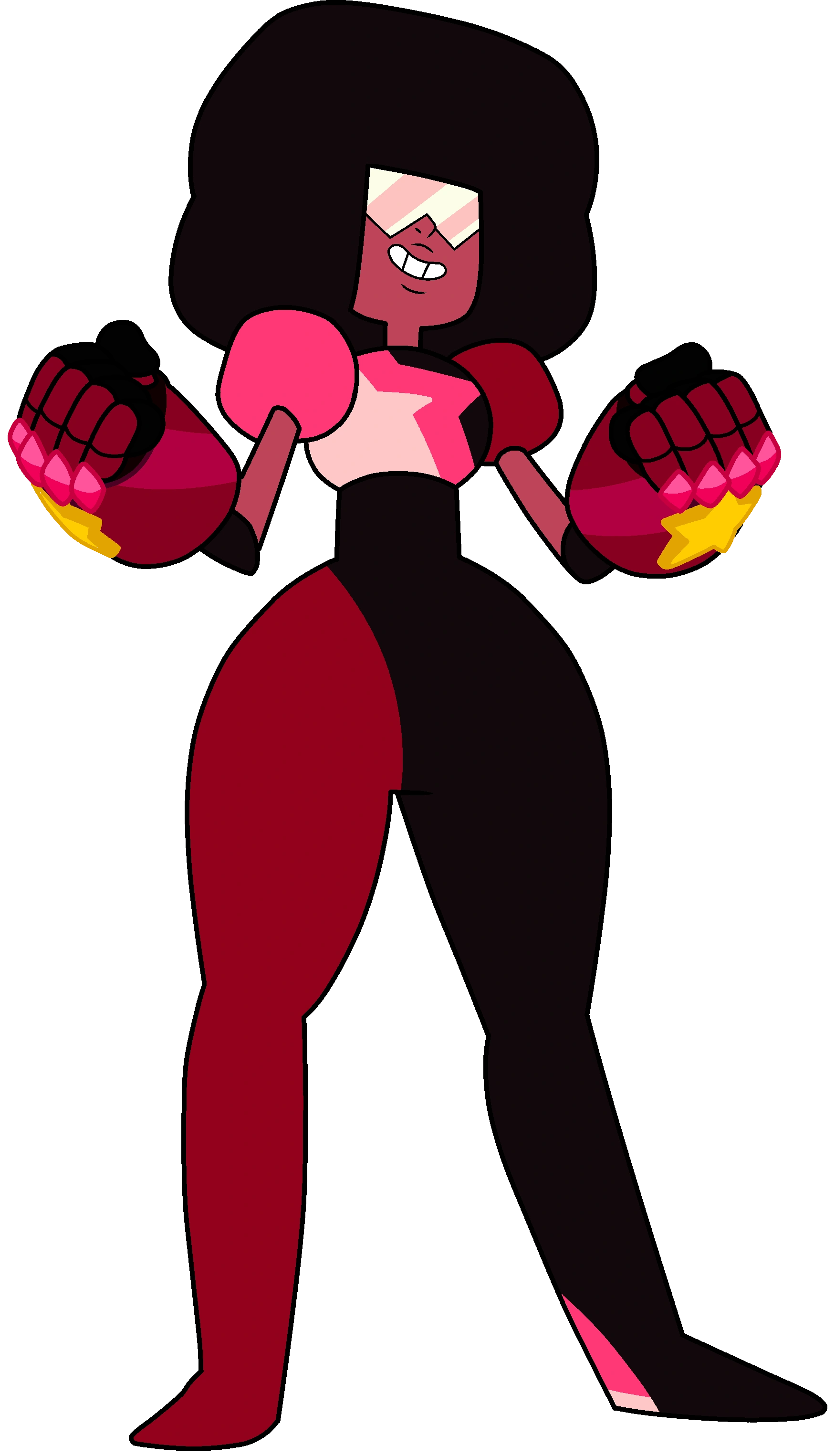 Ha la pelle di colore marrone e i capelli neri raccolti in uno stile afro a forma di cubo. Quasi sempre indossa il visore futuristico con le lenti a forma triangolare verso il basso, il visore è di colore arancione traslucido il quale copre tutti e tre gli occhi. Indossa un body nero e cremisi con una stella rosa contornata di magenta sul petto, le spalline hanno la caratteristica forma quadrata (quella di destra di colore magenta, quella di sinistra di colore cremisi). Garnet indossa anche guanti neri all'altezza del gomito che coprono il dito medio.
