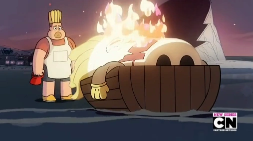 La scena si sposta alla spiaggia, dove alla mascotte Fryman viene dato un funerale vichingo (il costume viene mandato al largo nell'oceano su una barca in fiamme). Peedee chiede a suo padre se prenderà un'altro costume. Suo padre risponde che non ha bisogno di un'altro Frybo perchè ha Peedee. Steven, ancora nudo, afferma eroicamente che il loro lavoro lì è finito. Perla lo rimprovera di rimettersi i vestiti.