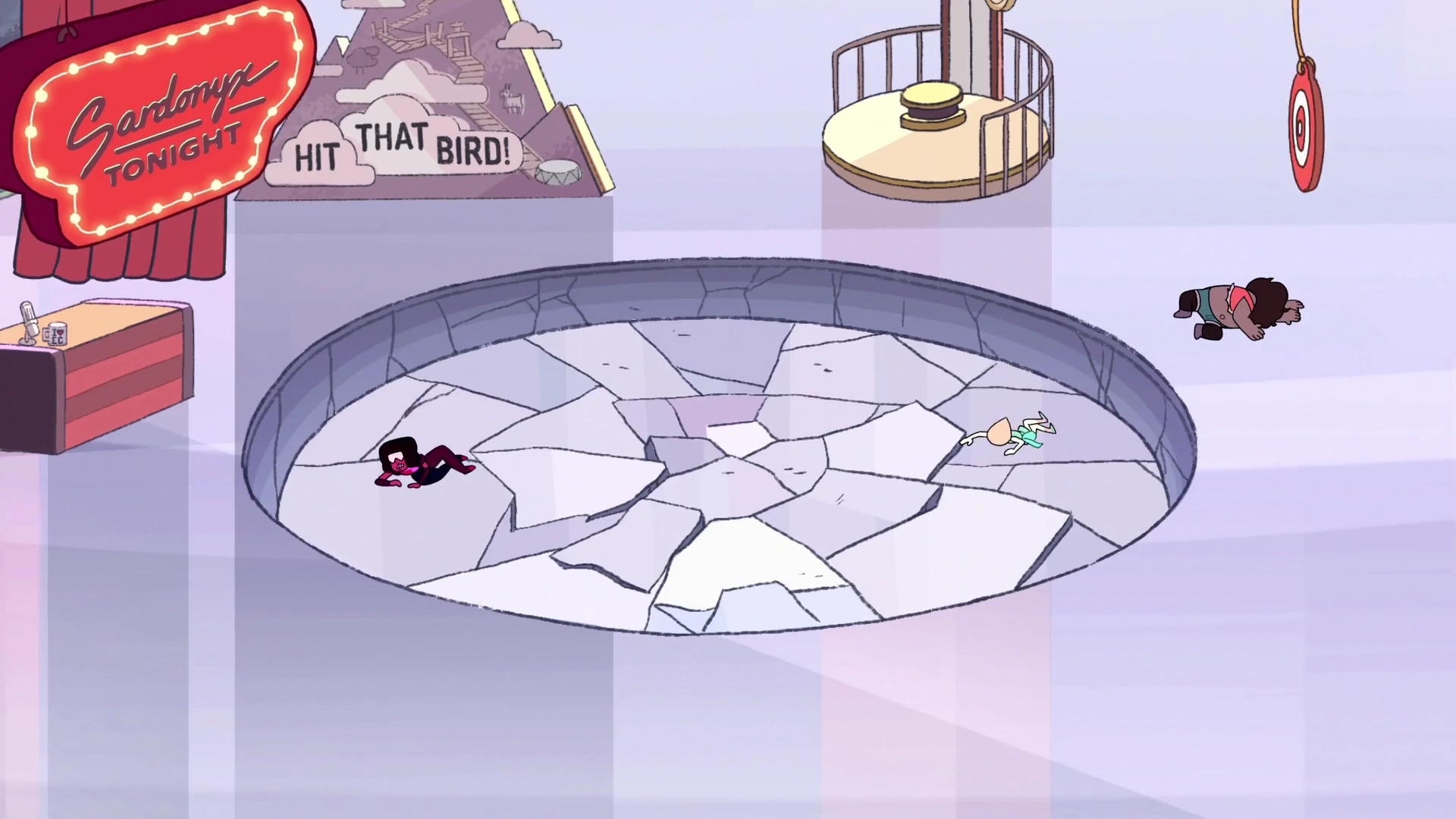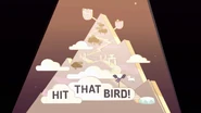 Sardonyks Tonight wraca na antenę. Sardonyks opowiada meta-żart o tym, jak postacie z kreskówek mogą skłonić ludzi do kupowania ich zabawek, zwłaszcza jej możliwych zabawek, które pomogłyby utrzymać Sardonyks Tonight w antenie. Sardonyks prezentuje swój kolejny segment, „Hit That Bird”, który przypomina „uderz w kreta”. Wspomina przygodę Opal w Podniebnej Iglicy i jak za pomocą łuku pokonała stado ptaków. Sardonyks daje Kwarc Dymny łuk, aby sprawdzić, czy mają ten „Opalizujący cel”. Kwarc dymny bada go, myśląc, że jest jak jo-jo, zanim Sardonyks uruchomi stoper. Zepsute cele dla ptaków wyskakują z rekwizytu górskiego, a Kwarc Dymny zaczyna strzelać do tych celów bez powodzenia, prawie uderzając w Sardonyks swoimi słabo wycelowanymi strzałami. Trwa to do momentu, gdy dzwoni zegar, sygnalizując, że „Hit That Bird” się skończyło. Kwarc Dymny zdobył zero, ale Sardonyks nie jest jeszcze zniechęcona i przechodzi do następnego odcinka swojego programu.