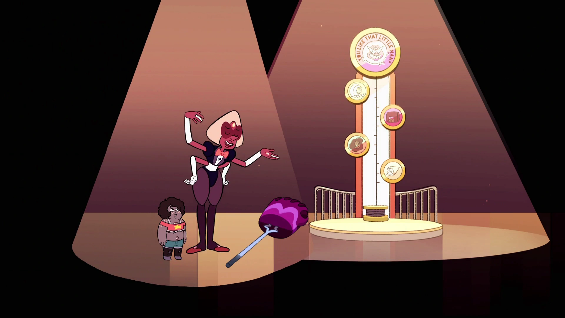 Sardonyks przedstawia następny segment, „Podoba ci się, mały człowieku?” Jego nazwę wymawia głos Sugilite, a sama gra jest odmianą Ring the Bell. Sardonyks zauważa, że „wszyscy uwielbiają oddzwanianie”, a następnie zaczyna pytać, czy użycie głosu Sugilite wymaga, aby pomimo fuzji zapłacono jej, nie bycie w odcinku. Prosi kogoś spoza sceny, aby to potwierdził, a ten odpowiada twierdząco (ku jej łagodnemu niezadowoleniu). Sugilite to symboliczna fuzja potężnej potęgi, ale Sardonyks uważa, że Kwarc Dymny może mieć coś, co może pokonać potężny zamach Sugilite. Sardonyks daje Kwarc Dymny młotek z głową przypominającą cep Sugilite. Kwarc dymny uderza w podstawę, krążek prawie sięga obrazu Pearl. Sardonyks sugeruje nadanie mu dodatkowego obrotu, co daje rekord Kwarc Dymny obok rekordu Stevonnie. Maszyna drwi z Kwarcu Dymnego, który reaguje, podnosząc swój rekord do poziomu Granatu. Maszyna nadal drażni Kwarc Dymny, a Sardonyks zastanawia się, czy Kwarc Dymny nie trafia w nią źle, ale ostatecznie dochodzi do wniosku, że Kwarc Dymny jest mocny „w inny sposób”.