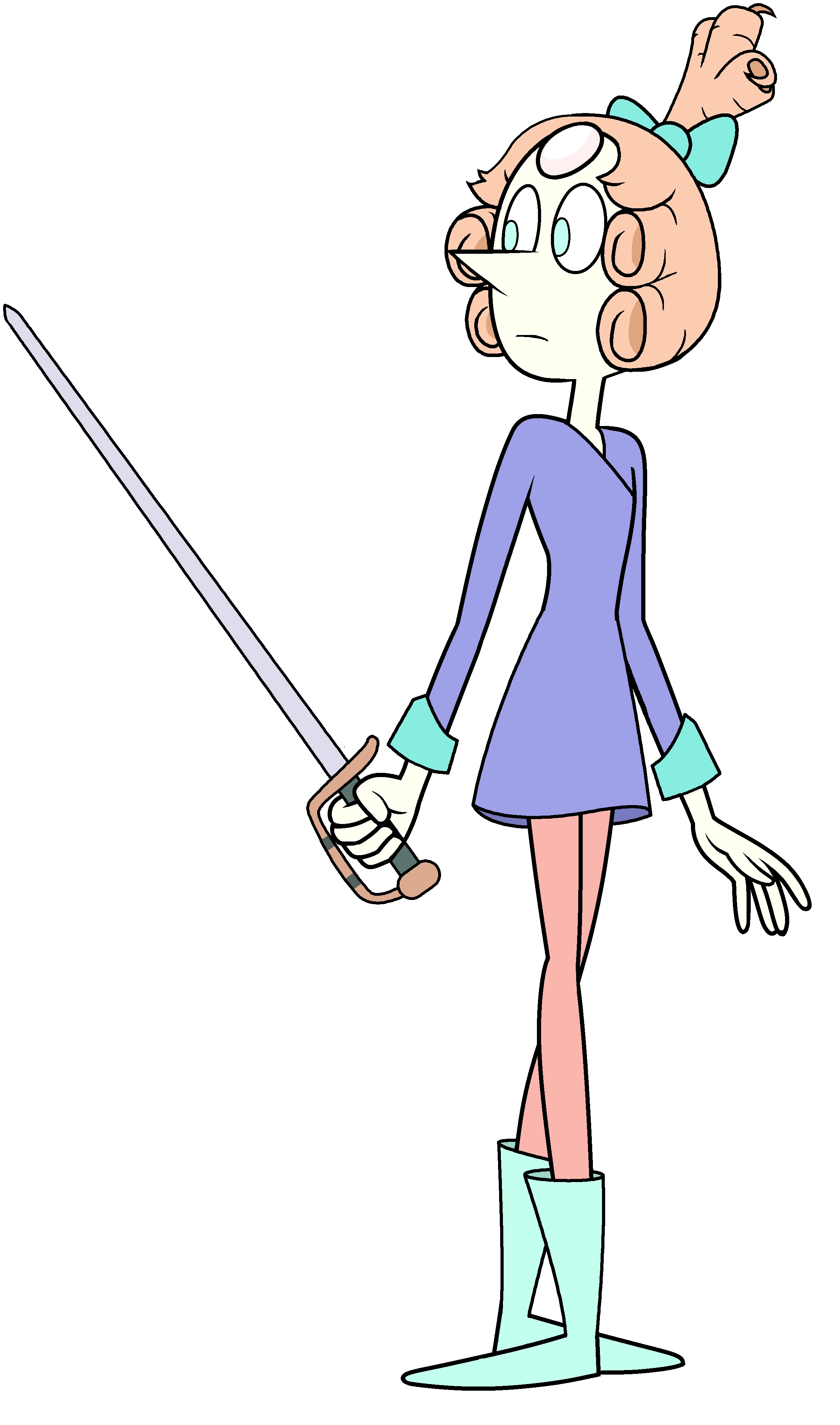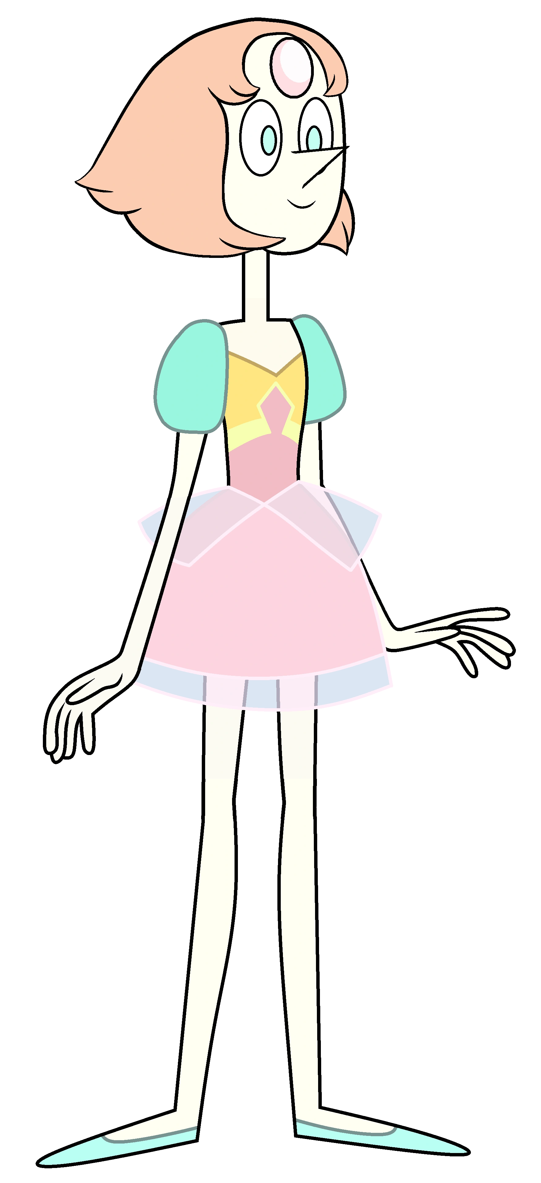 Perła miała na sobie krótką, różową sukienkę. Nosiła jasno-niebieskie buty.Jej włosy nie były uniesione tak wysoko. Na swoim stroju miała różowy symbol diamentu, któremu służyła. |