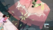 Nie trafia w Drużynę, a w znajdujący się za nimi filar, który zostaje zablokowany przez tarczę Stevena. Gdy Perła biegnie w kierunku Perydot, ta używa promienia ciągnikowego, dzięki któremu wyrzuca Klejnot na Stevena i powoduje zniknięcie tarczy. Następnie rusza do niej Ametyst, która zwija się w kłębek i szarżuje, jednak Perydot unika ataku, przez co Klejnot wpada do odłamków. Perydot ucieka na jeden z teleporterów, ale szybko się zawodzi, ponieważ nie działa. Wtedy Granat rzuca ułamany filar do Ametyst, która łapie go biczem i miota w wroga. Perła, chcąc złapać spadającą Perydot, wpada na Granat, przez co Klejnot w ostatniej chwili tworzy ze zbroi helikopter i podlatuje do najbliższego działającego teleportera, którego używa.