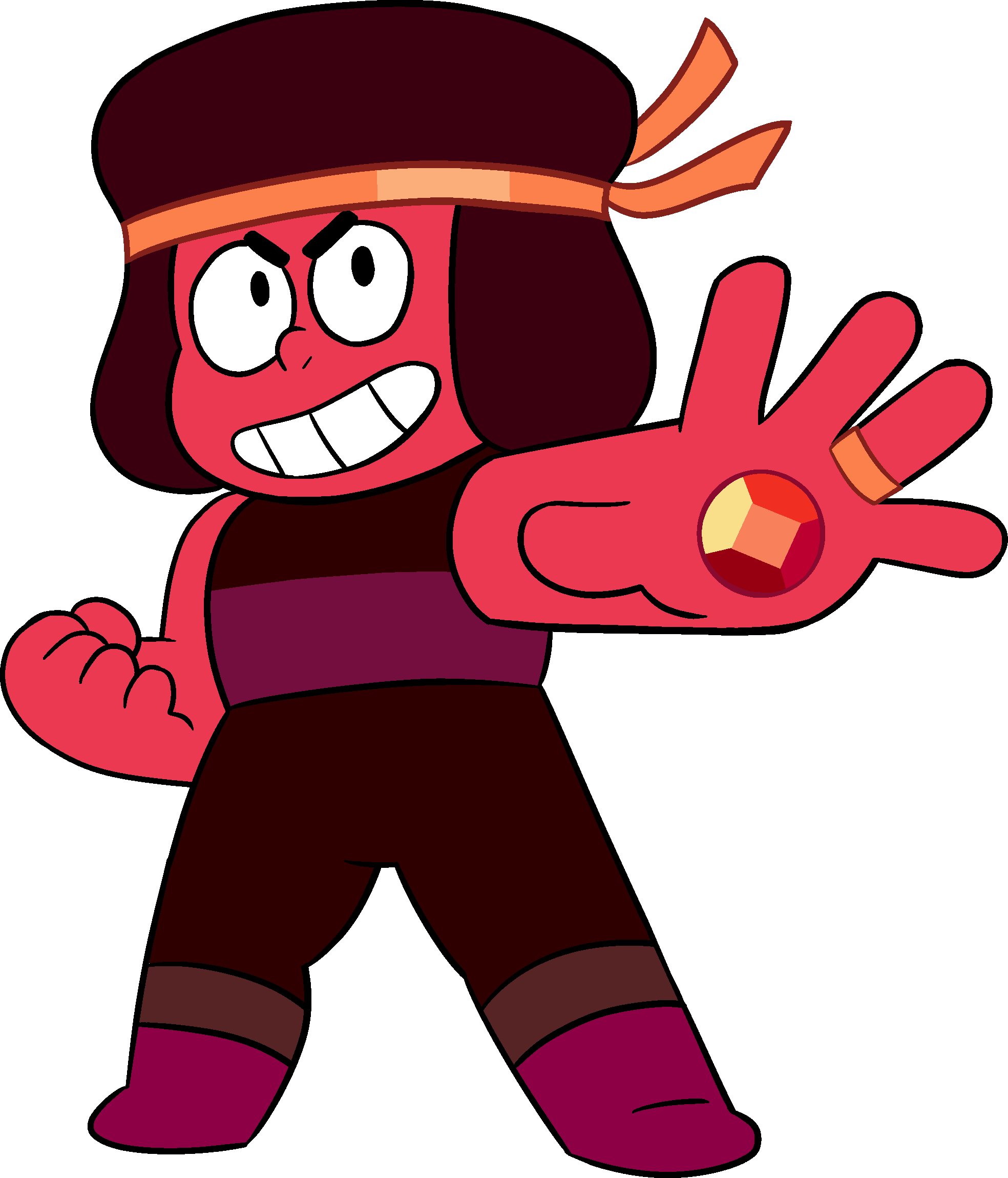Rubin miała na sobie ciemnoczerwone szorty i top bez rękawów, przedzielone ciemnoceglastym paskiem obwiązanym wokół talii. Przez środek jej piersi przebiegał pasek tego samego koloru. Na stopach nosiła czerwone buty. Jej włosy nie były związane, oraz były jaśniejsze niż teraz. |