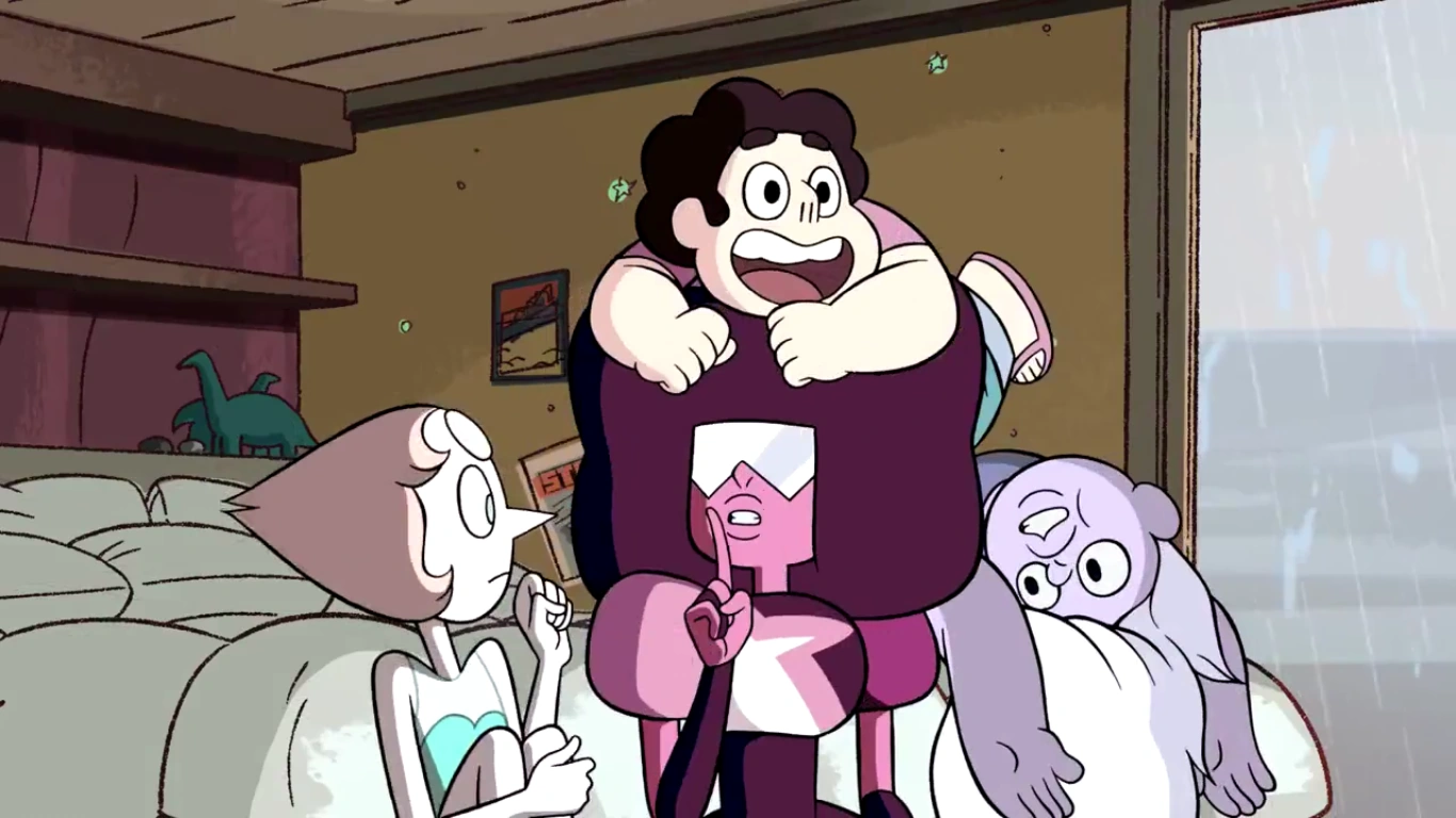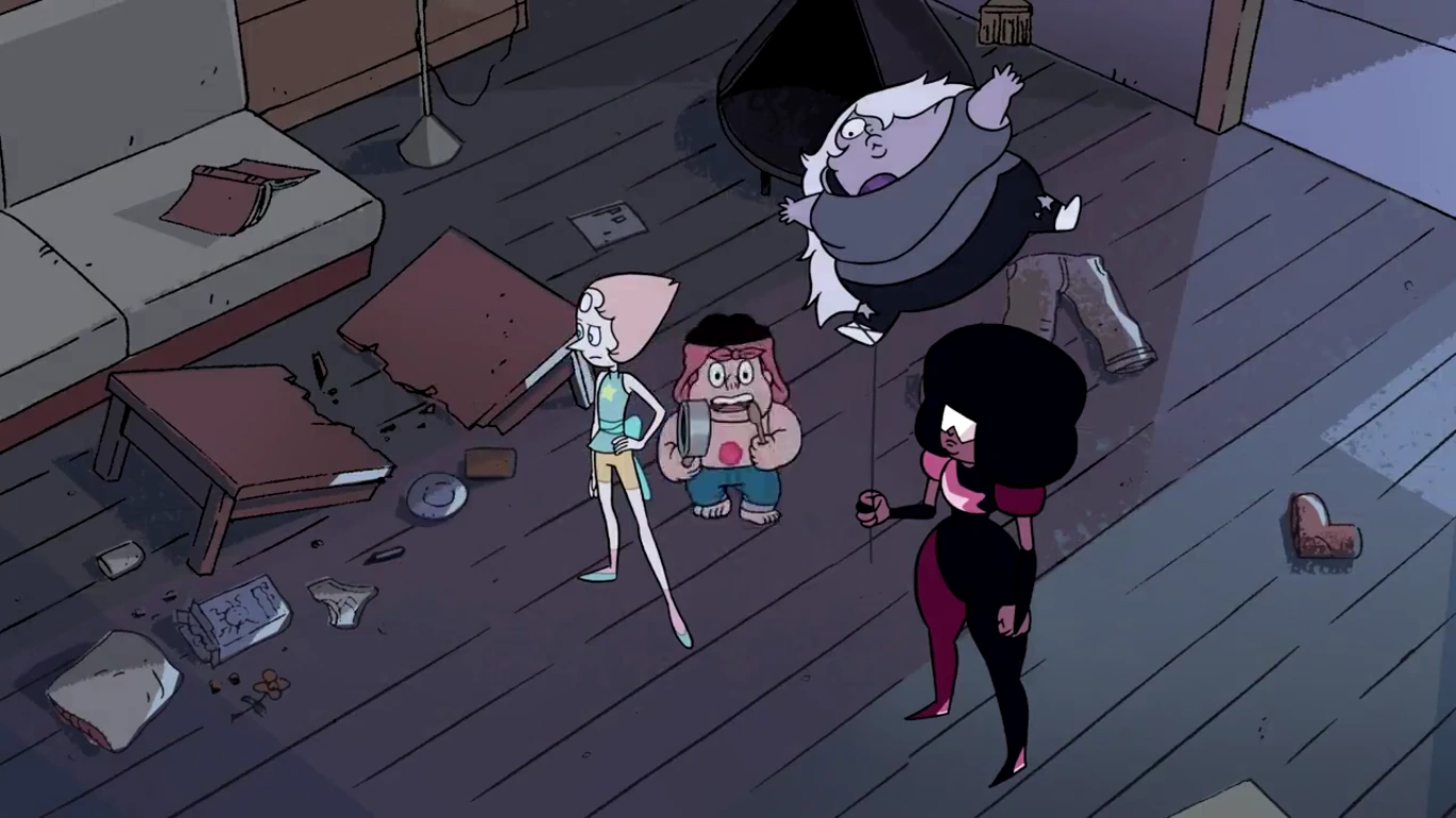 Klejnot ten uniósł się po czym podleciał do całej trójki. Perła wróciła do fizycznej formy (w nowym stroju), a chłopiec powiedział, że to co chciał powiedzieć nie było aż tak ważne. Gdy już wylądowała na podłodze Steven podbiegł do niej i ja przytulił. Uradowana i lekko zaskoczona Perła spytała się go czy ten aż tak się stęsknił, na co chłopiec odparł,że przygotował mnóstwo rzeczy na jej powrót. Gdy ten się oddalił Perła spytała się co się stało z jego pokojem, po czym podeszły do niej Granat z uczepioną na sznurku Ametyst. Następnie Perła spojrzała na nadętą Ametyst i powiedziała, że "Nawet nie pytam co się stało Tobie" na co Ametyst odparła "Zderzyłam się z Samolotem". Wtedy do salonu wszedł Steven mając na sobie jedynie spodnie i koszulkę zawiązana wokół głowy. Chodził po pokoju trzymając w dłoniach łyżkę i garnek, którymi wystukiwał rytm, przy czym wołał cały czas "Perła Wróciła! Perła Wróciła". Zażenowana Perła spytała się co chłopiec wyprawia, wtedy Ametyst beknęła. Perła powiedziała "Nie można zostawić was na sekundę". Steven podskoczył przed nią i zwołał "Wróciła!".