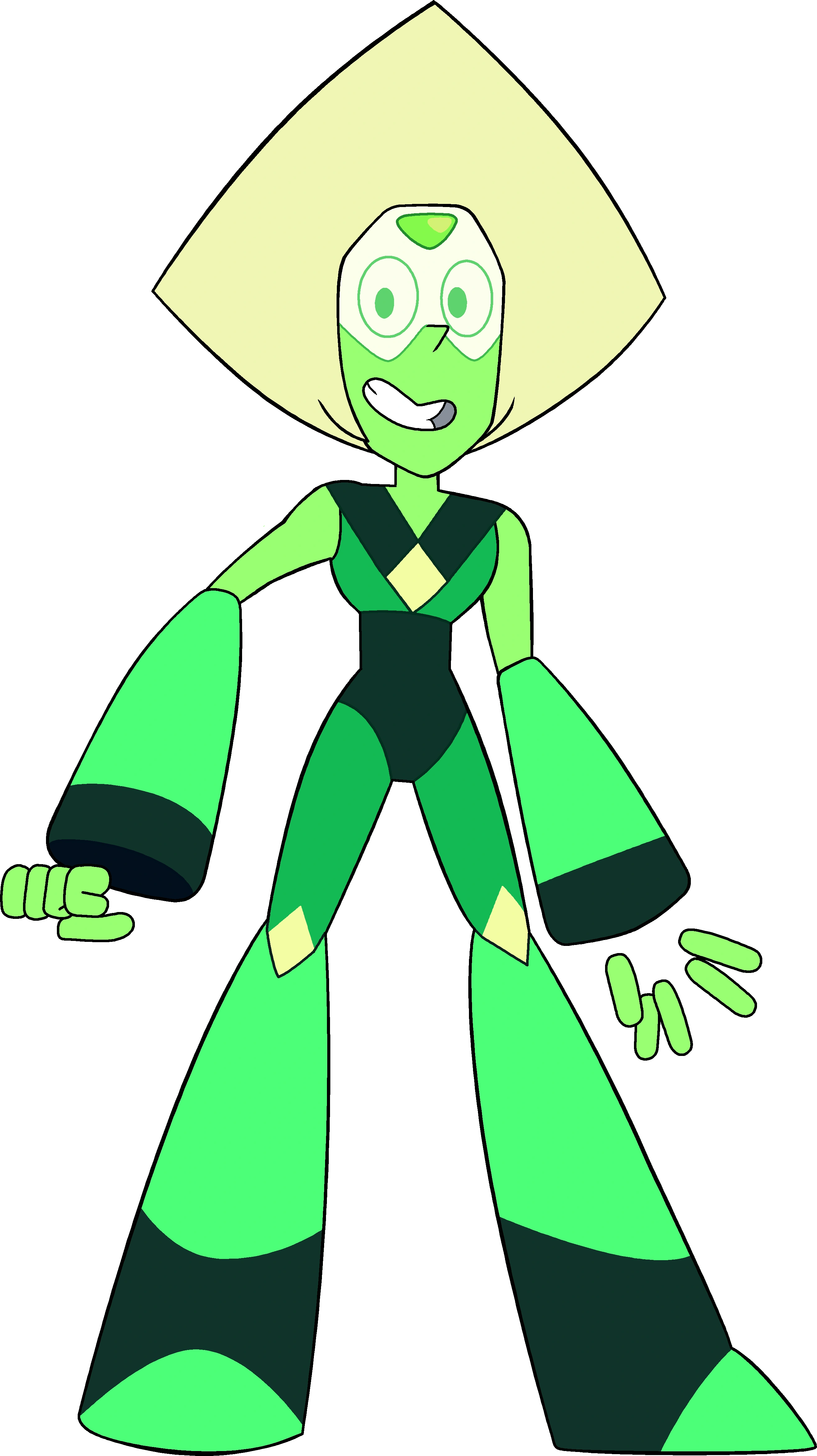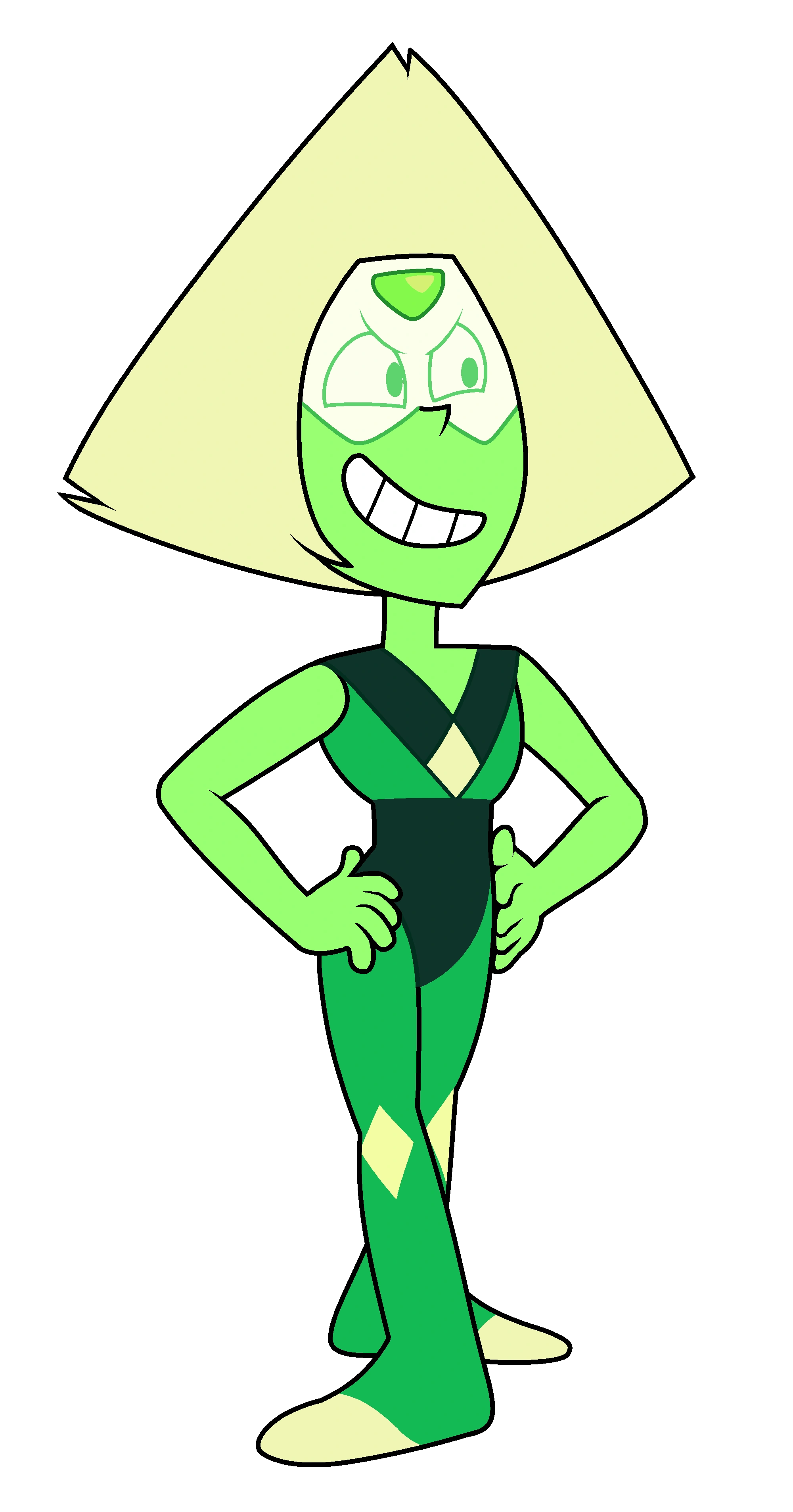 Peridot are pielea verde-lămâie, părul verde-pal în formă de triunghi isoscel cu unghiurile congruente de 80° și unghiul de sus (cel care nu este congruent cu celelalte) este de 75°. Adevărata culoare a ochilor ei nu e cunoscută momentan. Limba și gura ei sunt albastre, gura neavând buze. Ea are un guler de 90° (adică cu un ∢ în formă de „V“), unde semidreptele care se intersectează o fac formând un diamant galben. Nestemata ei este localizată pe fruntea ei, fiind triunghiulară, cu colțurile rotunjite, fiind cu un ∢ de 90° în jos, și cu 2 ∢-uri de 45°, în stânga și în dreapta.