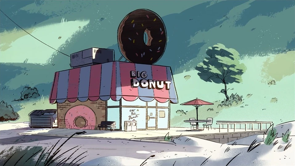 На крыше магазина установлена вывеска в виде большого коричневого пончика с надписью «Big Donut». Внутри магазина можно найти различную выпечку, автоматы, кулеры. На стенах висят плакаты, рекламирующие различные продукты. За магазином находится склад; чтобы попасть туда, нужно пройти по коридору. Помимо этого, в магазине есть комната персонала, где отдыхают работники. Перед магазином находится парковка. C создания пекарни прошло 2 лета, как твердит Сэйди. Стивен называет её пончиковой (в русской версии мультсериала).