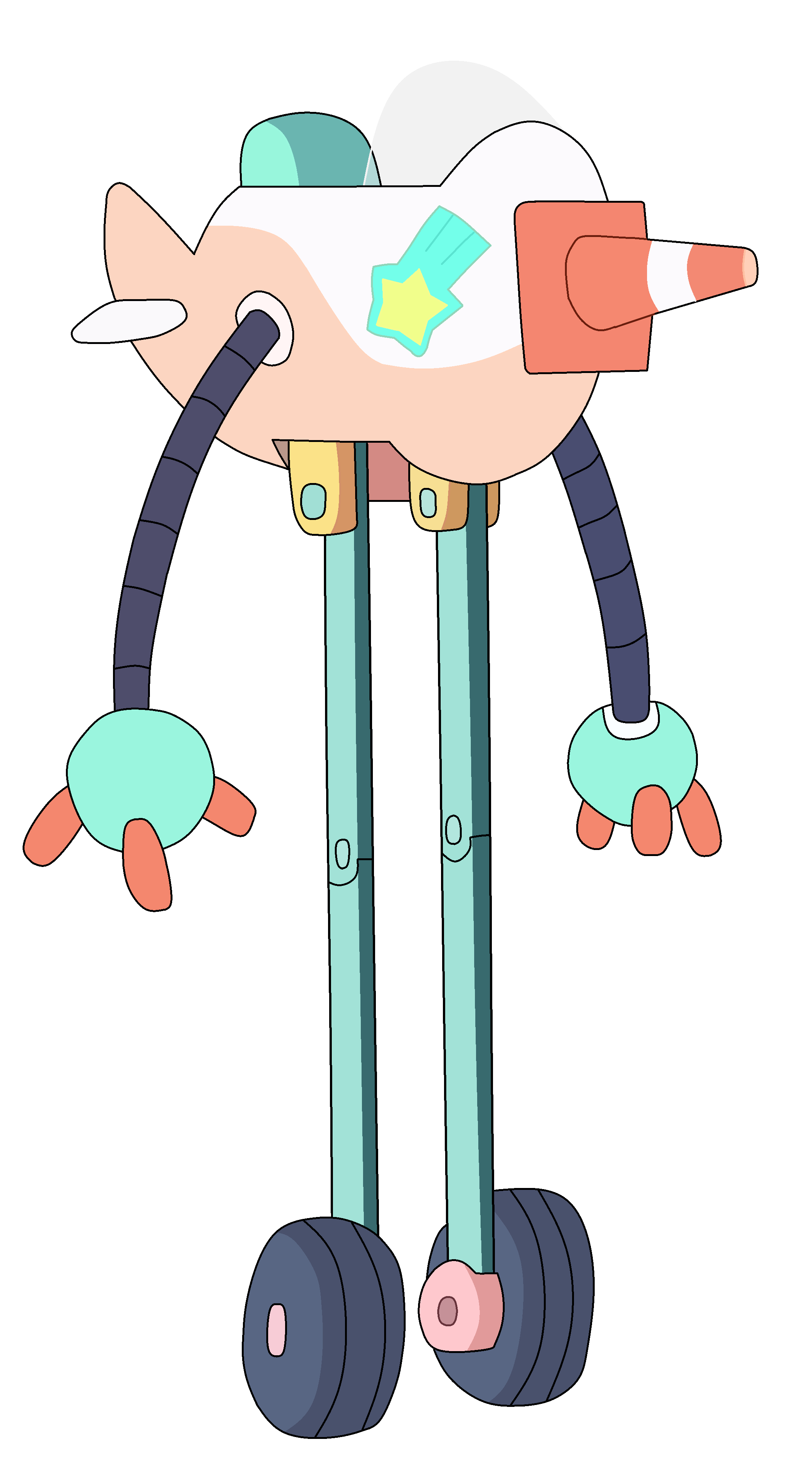 Его корпус похож на космический корабль, на нём есть стикер звезды и конус. По бокам руки, с шарообразными ладоням и тремя пальцами. Длинные, сгибающиеся ноги на колёсах.