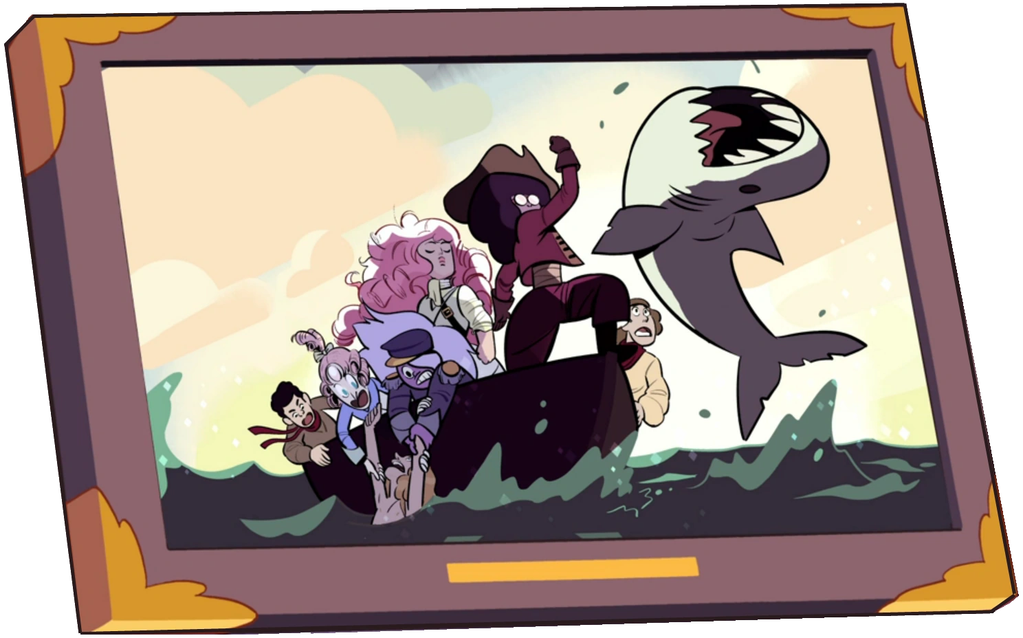 На картине изображены Кристальные самоцветы, спасающие людей от акулы.