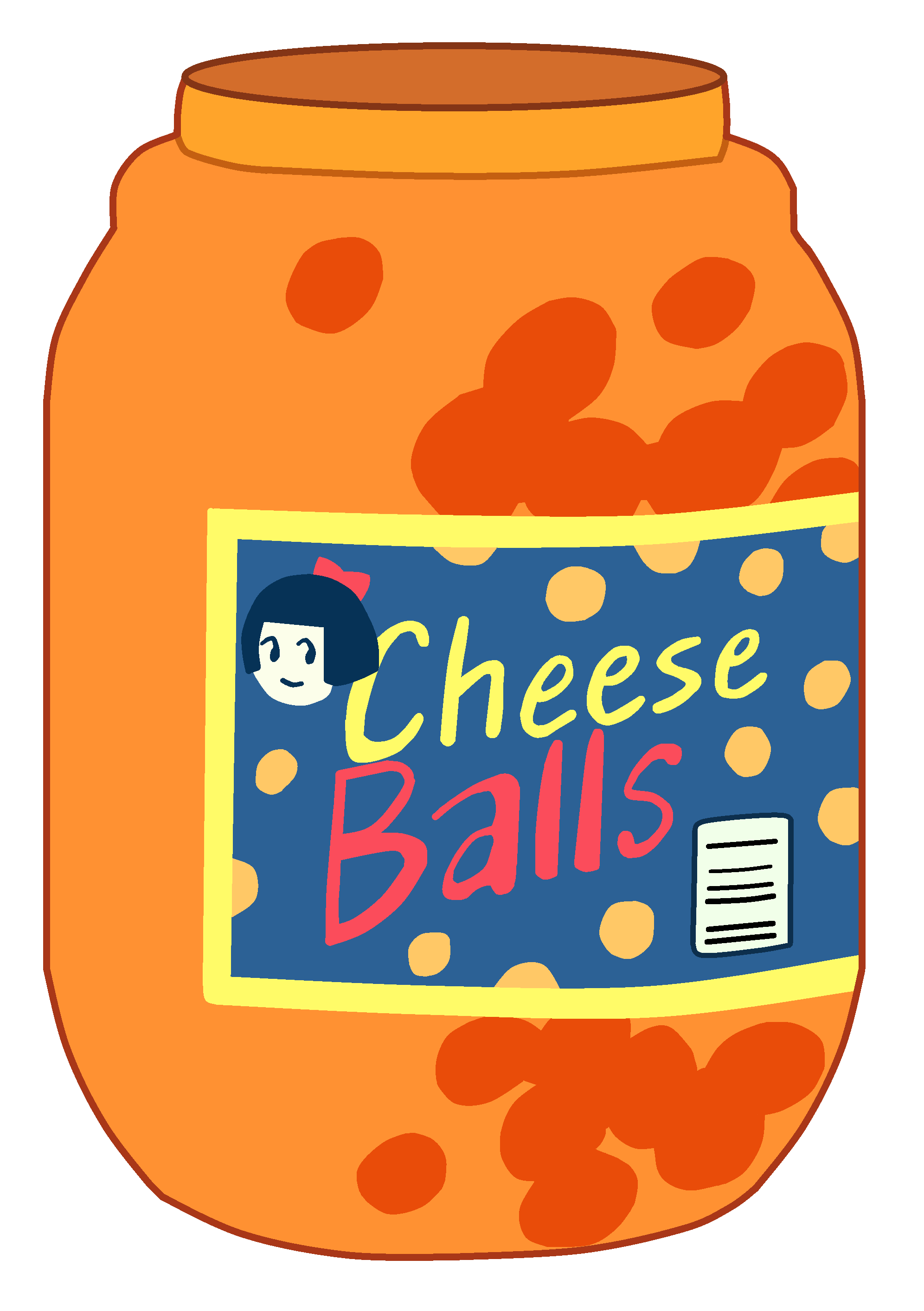 Сырные шарики находятся в большой прозрачной банке оранжевого цвета с синей этикеткой, выделенной светло-жёлтым контуром. На этикетке изображены сырные шарики, логотип из слов «Cheese» (светло-жёлтого цвета) и «Balls» (насыщенного розового цвета), а также маленькая девочка в верхнем левом углу этикетки. В нижнем правом углу этикетки находится штрих-код продукта.