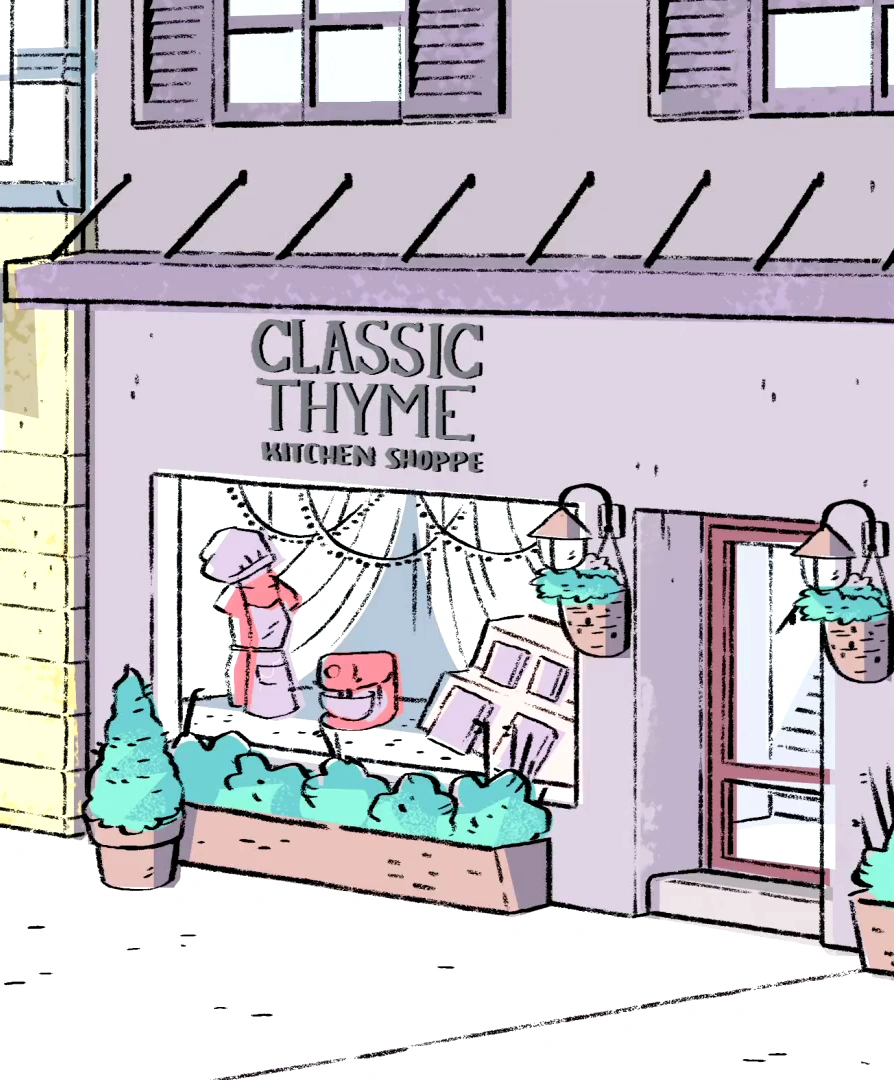 Фасад магазина — светло-лавандового цвета. Два растения свисают по обеим сторонам входной двери, а перед витриной стоит ящик с растением и манекен, одетый в фартук и поварской колпак, также там стоит миксер и несколько книг.