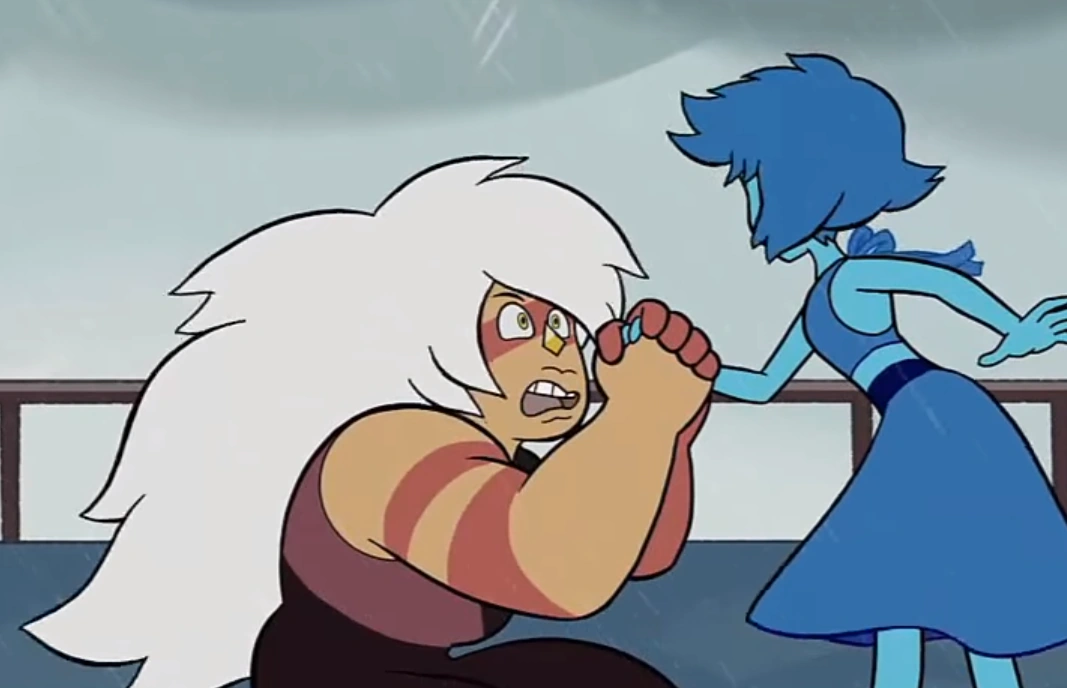 In "Alone at Sea", Jasper begs Lapis to re-fuse with her, claiming they were better together than apart. She claims that Lapis is a monster, and only she could handle that power. Jasper appears sycophantic, claiming that she has changed. After being rejected, she became enraged and attempted to "shatter" Steven until she was thrown back into the ocean by Lapis.