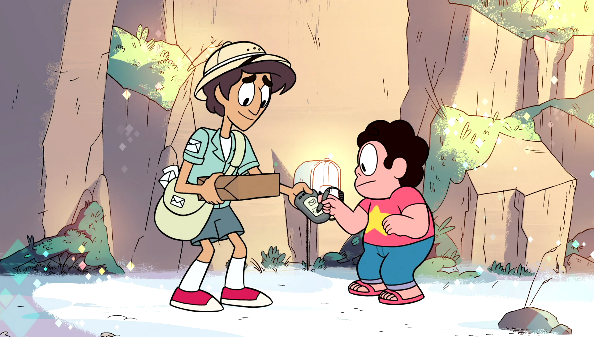 The episode begins with Steven sitting on top of his mailbox, singing his Hey Mr. Postman song. Jamie, the postman arrives and after he takes numerous objects out of his bag, Jamie finds Steven's package from a company called Wacky Sacks Supply Company. Steven explains that what’s in the package is a valuable piece of equipment that will help him save the world when he sees a flash of light erupt from his house, meaning the Crystal Gems have returned from their latest mission.