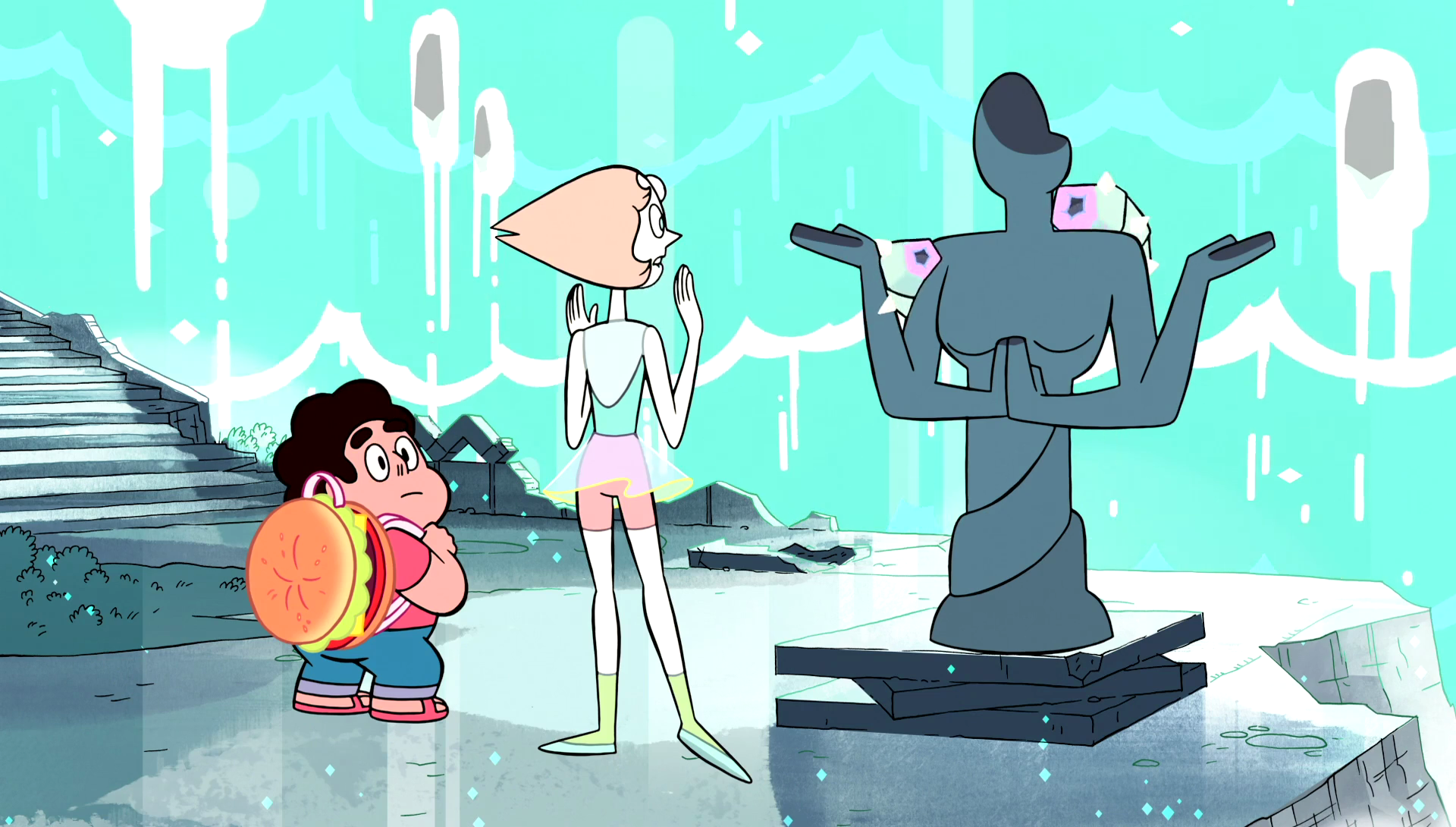 They continue to the top where the statue needs to be placed, and Pearl is distressed at the sight of all the crumbling statues and walls. Pearl tells Steven the possibility that the place will all be repaired once the Moon Goddess Statue is placed, but they suddenly come face to face with an infestation of Crystal Shrimp. Steven wonders if he can just squish them, but Pearl stops him, saying that their shards are deadly. Pearl comes up with a complex plan and starts to explain it, but Steven simply throws two bagel sandwiches from his backpack into opposite ends of the room, attracting the shrimp in two different directions and clearing the path. The Gems are so impressed with his ingenuity that when a ravine forms in front of them and fills with water, they immediately look to him for a plan. Steven reaches into the backpack and pulls out the first sensible item he packed: a raft. Unfortunately, as soon as he tosses it into the water, it is carried down a waterfall. Garnet bridges the water flow by smashing over a column, but says that Steven had a nice idea despite things.