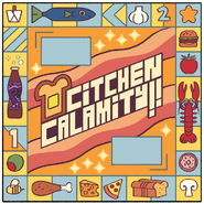 The board has a blue backdrop with the words "CITCHEN CALAMITY" written across it in white print over a black text box. The board is shaped like a Monopoly board, and the squares running down the perimeter are of multiple colors, including dandelion yellow, blue, green, and yellow/blue stripes. The blue backdrop is outlined by a thick, yellow-sea orange frame.