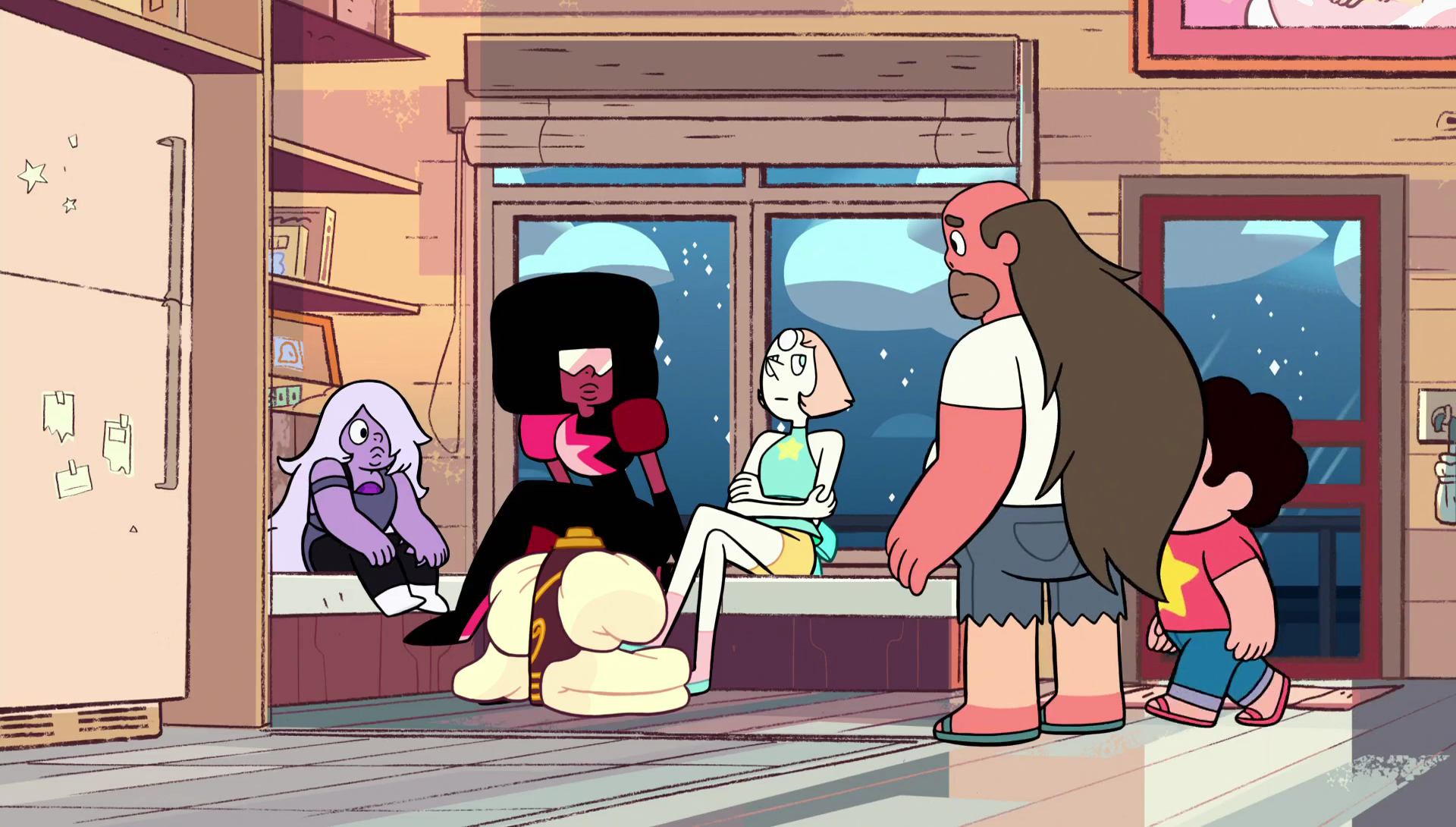 The members of the Crystal Gems would rarely interact with Greg early on, despite being Steven's father and the lover of former Crystal Gem Rose Quartz/Pink Diamond. It appears that the main reason behind their lack of communication was because although the Gems do not have any negativity towards Greg himself, they still thought he was not the most composed person. Amethyst best summed up the Crystal Gems' general feelings on Greg when she describes him as "kind of a mess". Due to this fact, they advise Greg to stay out of "magical matters", as they felt they were much more capable than him. Greg did not seem too open-minded, as he, like most humans, seems apprehensive, if not terrified, of "magic Gem stuff". However, even with their belief of Greg's somewhat questionable reliability, Greg has come to their aid when he is needed (as seen in "Laser Light Cannon"), but it seems that this only occurs at Steven's request.