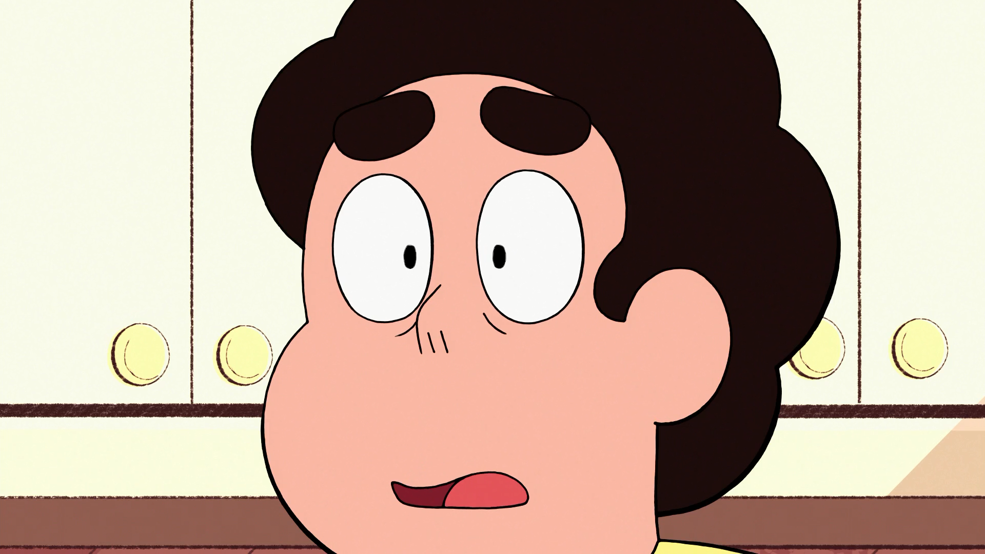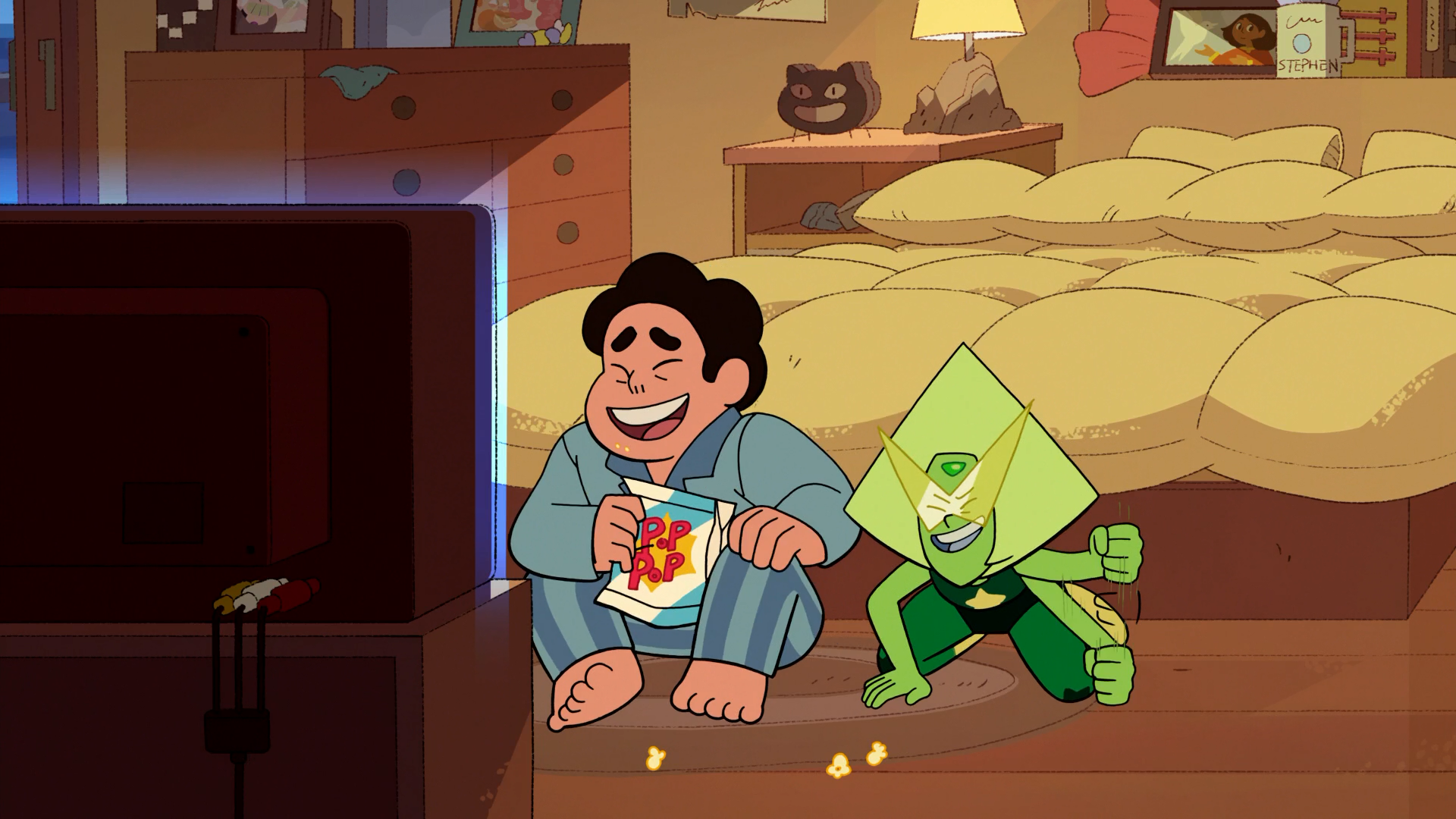 - When Steven "wakes up" within his dreams to see Peridot sitting in front of the TV unresponsive, they're in his old bedroom from the original series.