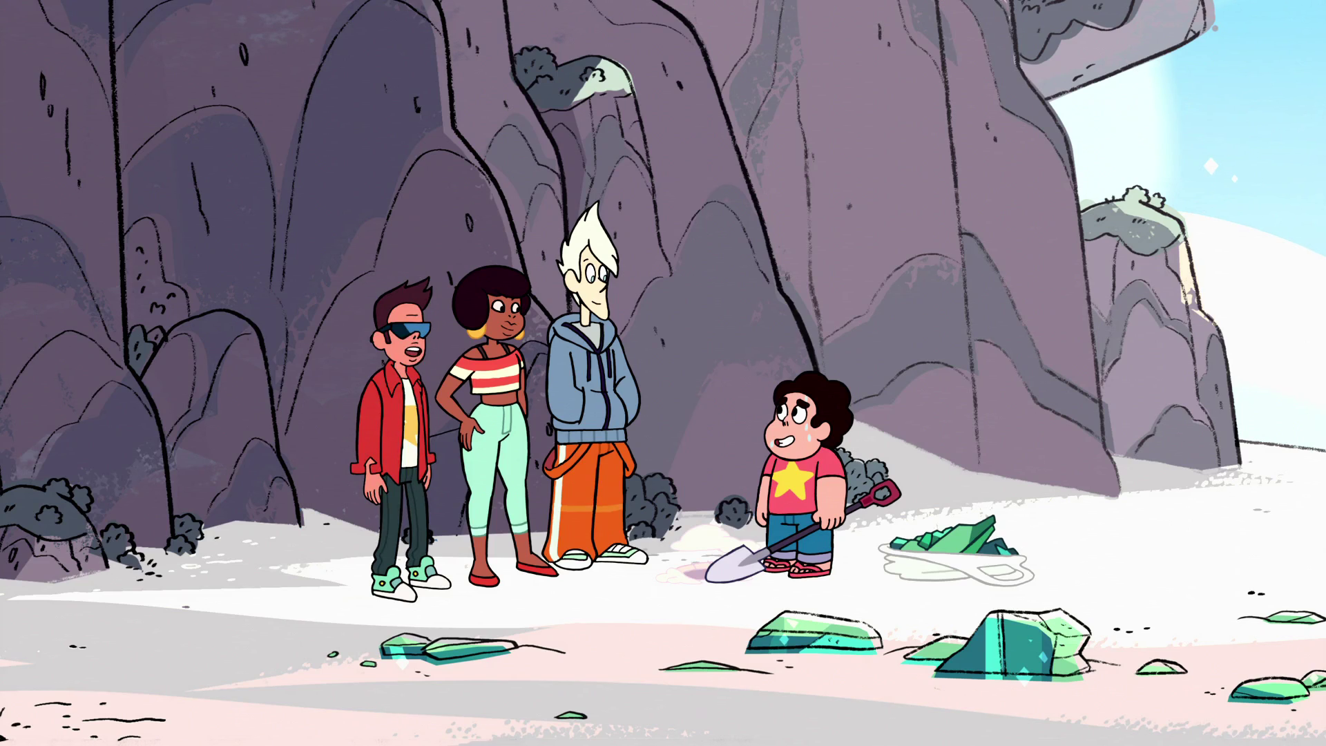 Steven and the Crystal Gems are hard at work cleaning up the destroyed pieces of the Gem Warship. A shovel-wielding Steven digs at the sand and unearths a palm-sized fragment; he questions why it is necessary to find every last piece of the wreckage. Garnet states that having a wrecked Gem ship lying around is too dangerous, but does not elaborate further. Pearl also suggests starting a search for Peridot's escape pod as well. Steven heads off alone to dig up more ship fragments, and in moments becomes so invested in his work that he does not notice the Cool Kids (Jenny, Buck, and Sour Cream) calling for him. When they finally do get his attention, standing a few feet away, Jenny quips with "Welcome back to Earth," which Steven initially takes literally. The Cool Kids invite Steven to hang out with them; they appreciate how his positive nature offsets their cynical world view. However, Steven turns them down, saying he has too much work to do for the day.