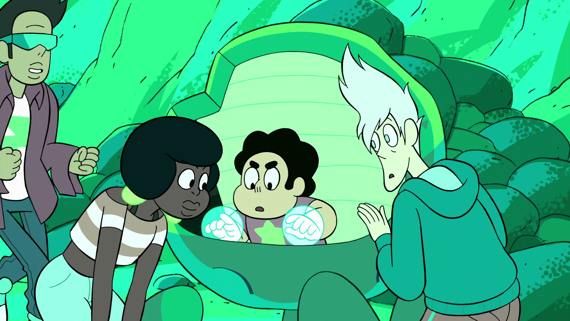 The Crystal Gems notice the flare and run to the field to stop what they believe is Peridot attacking the kids. Garnet orders the Gems to attack the pod with everything they have, almost killing Steven in the process. Just before Garnet can land the final blow on the pod, Jenny stops her and explains that Steven is inside. Garnet, upon closer look, sees Steven's silhouette and breaks the pod open. The Gems become worried and flustered over Steven for not having warned them about Peridot's pod sooner, and Garnet states that she is disappointed in him. The Cool Kids defend Steven by telling the Gems that he has been through a lot and needed a break. The Gems agree with them after realizing that they were too tough on Steven, especially since he saved them back in "Jail Break". Garnet ungrounds Steven from watching television as he hugs her, and the Gems and the kids take selfies together.