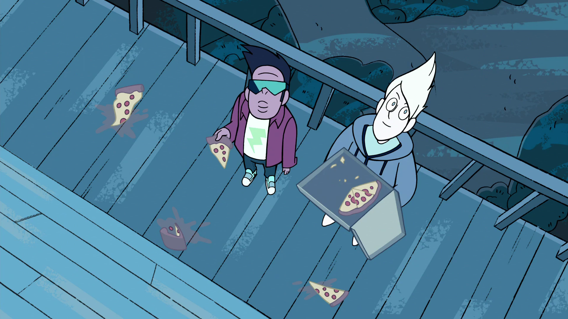 That night, as Steven lays in bed, sore from the day's work, Steven sees a slice of pizza hit his window, which he mistakes for "pizza rain" until he sees Buck and Sour Cream standing below, throwing slices of pizza to get his attention. When Steven comes outside to ask what they are doing, Buck says he "only wanted to see [Steven] laughing in the pizza rain"; Steven wonders if Buck is making some obscure reference. The Cool Kids invite him to hang out with them; Steven is bewildered by the concept of hanging out at night, but Buck argues that since he works all day, there is no better time to hang out than at night. Convinced, Steven decides to tag along.