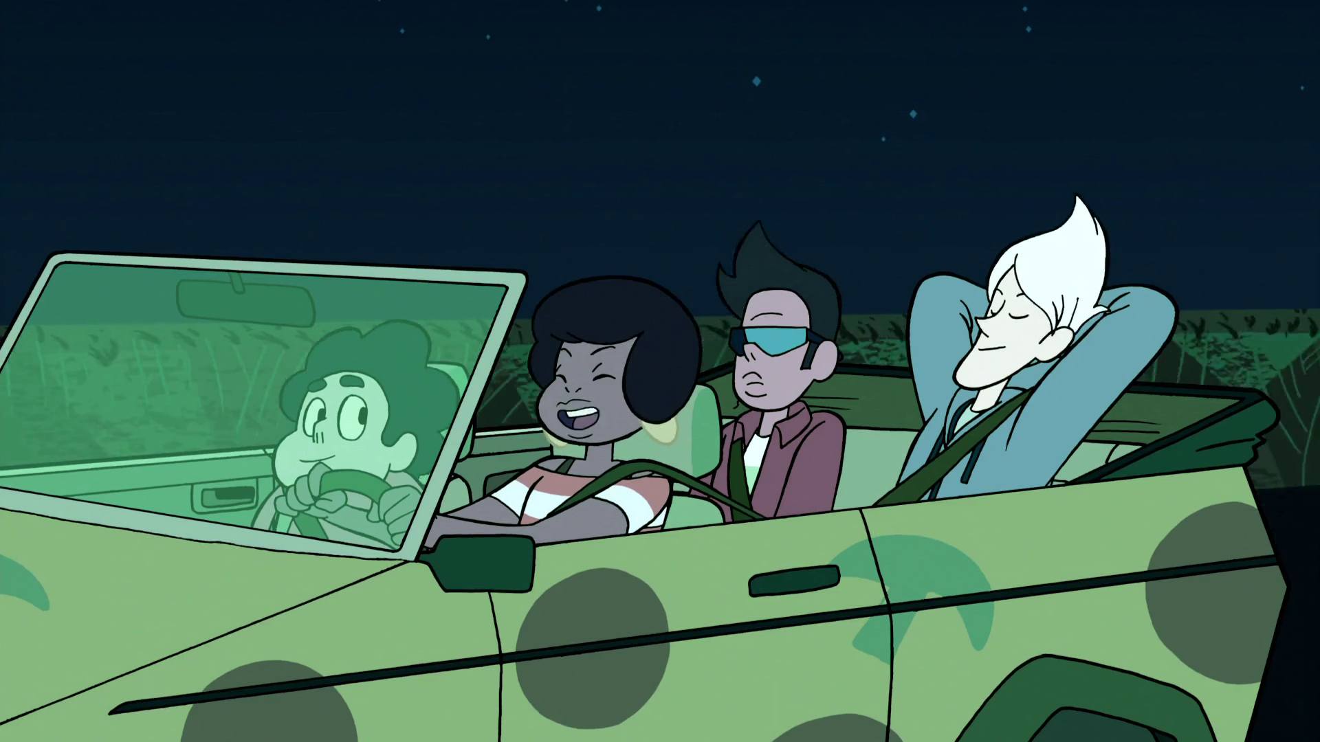 As Steven rides in the front seat of Jenny's Car, the Cool Kids bring up their family issues one by one. Sour Cream wants to be a DJ, but his stepfather does not approve, insisting he takes up the family business and be a fisherman. Buck's father, Mayor Dewey, is always telling him how to behave so he can protect his own public image. Jenny is annoyed by how her twin sister constantly gets on her case for her wild and reckless lifestyle, and pressures Jenny to be responsible like her. Steven tells the Cool Kids that a few months ago, the Gems and his dad grounded him from TV (as of "Fusion Cuisine") as the Cool Kids become surprised. However, the Cool Kids all get some much-needed perspective when Steven talks about his family problems. He has recently learned that the Crystal Gems are exiles being hunted down by the Homeworld Gems for their perceived treachery, he is going through an identity crisis about whether he is really his own person or just a reincarnation of Rose Quartz, and he does not feel that he can talk to the Crystal Gems about his problems because he thinks they blame him for Rose's death. The Cool Kids are impressed that he can shoulder all of these problems and still maintain his upbeat attitude.