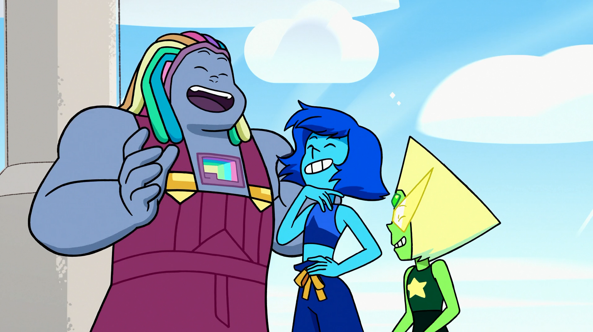 During the feast, the latter is the only one who laughs at Lapis' jokes with her and even predicts when Lapis is willing to high-five her. Peridot seems to be considerate of Lapis' feelings, trying not to use the "J Word" (Jasper) around her and clings onto her when Amethyst (shapeshifted as Jasper) asks them if they wanted to be her prisoners when the rubies returned. Lapis is also more willing to respond to Peridot's calls, responding when Peridot tells her she is going out and asks whether she needs anything, and reaching out to try to catch Peridot's bow tie when she threw it, though it sailed over Lapis' head.