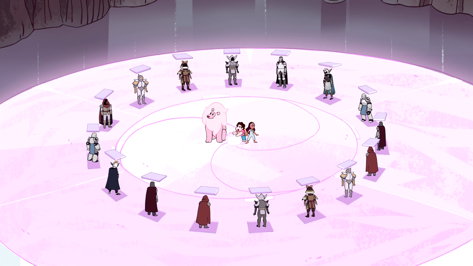 They walk onto a section of the floor, and it starts to glow. A podium emerges from the floor. Steven places his hand on it and gets stuck. Connie says that they will have to chop his hand off, Steven screams, and a collection of swords comes out of the ground. Connie finds out that poking, tickling, and squeezing parts of Steven's body reveals additional varieties of weapons and armor, Laser Light Cannons (the Quartizine Trio), spiky chain-balls (the Heretic's Anguish), and a giant penny. Steven then unwittingly activates a floating robot that shoots various projectiles at Steven, Connie, and Lion. Lion helps them escape the temple and takes them to the Beach City theater, but the robot follows them through the portal.