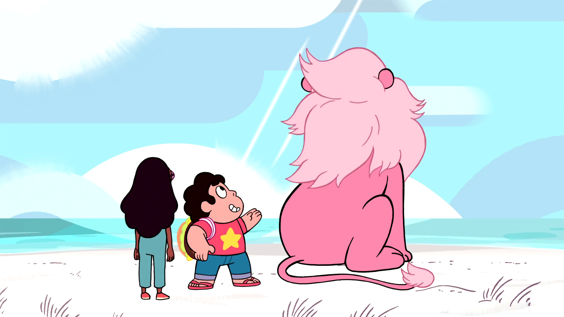 Similar to when Connie asked about Steven's bubble in "Bubble Buddies", Connie asks if Lion has run out over the ocean before, to which Steven responds "No, this is new."