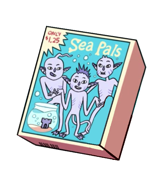 Sea Pals are aquarium pets sold in hatching kits. A single box appears to cost $1.25 and can be ordered via mail. The front of the box has an illustration of three "Sea Pals", which look like aquatic humanoids, along with a fish bowl. The back appears to have a picture of some sort of environment. In "Love Letters", Jamie, having recently returned to his postman duties, delivers several boxes of Sea Pals to Steven, who explains to Connie that he kept ordering the product when his first order did not arrive. Steven later tells Connie that he intends to set the Sea Pals free into the ocean. Sea Pals appear again in "A Single Pale Rose" among the large collection of organized items in Pearl's pocket dimension.