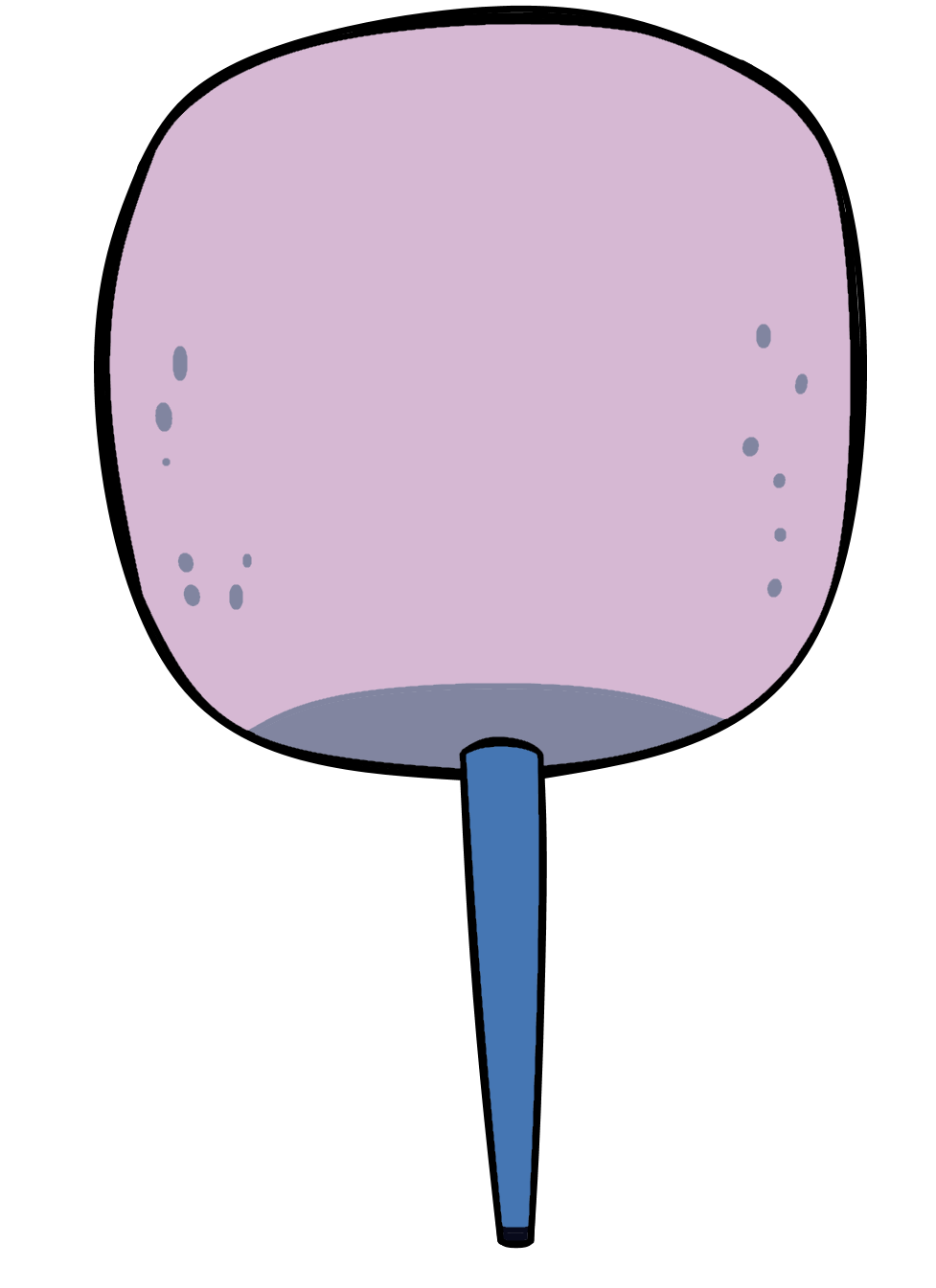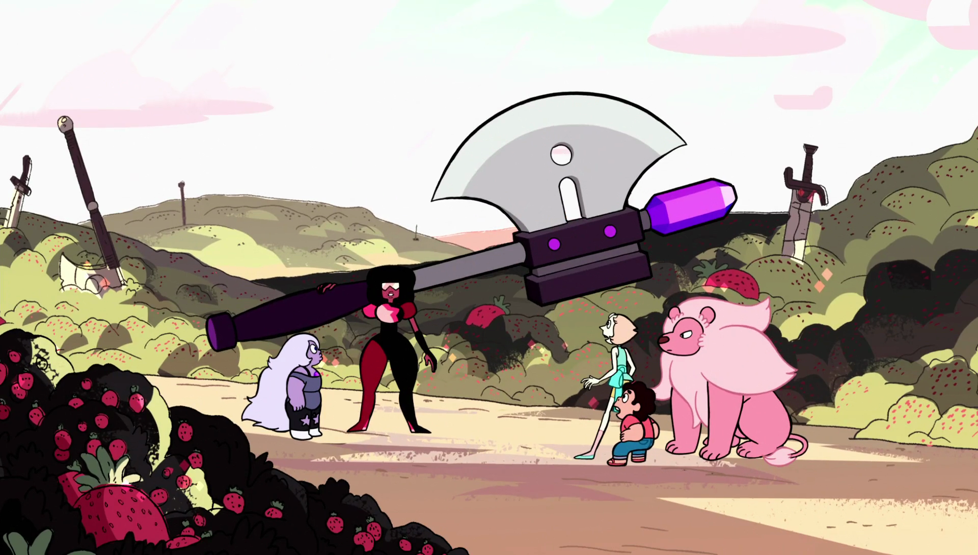 The giant purple axe is a massive battle-axe retrieved by the Crystal Gems in "Rose's Scabbard". It was taken from the Gem Battlefield with strawberries growing in a swarm around the blade. The axe has a midnight purple grip, curved with purple, cylindrical ends on either side. It then leads into a metal handle which ends in a machete-type housing for the blade complete with purple bolts, the blade being a massive gray crescent shape with an exclamation-point shaped cutout in the middle of it.