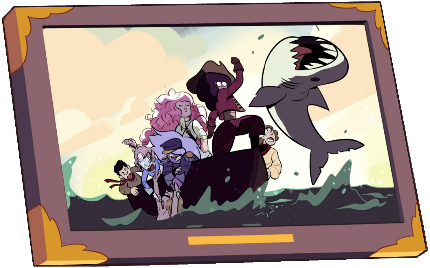 The Old Gem Painting is a painting that made its debut in the episode "So Many Birthdays". Rose, Garnet, Amethyst, and Pearl, along with a few humans, are seen on a dark brown boat at sea. Garnet is punching a shark, Amethyst and Pearl are helping a human that fell in the water, and Rose is boldly standing upright. They are all wearing old vintage clothing. The picture frame is dull brown and has golden edges. According to Garnet, getting the shark to pose was the hardest part.