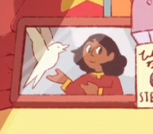 Since Steven Universe: The Movie, a photo of Connie Maheswaran with a white bird can be seen on a shelf in Steven's new room. The posing may be a reference to the "Is this a pigeon?" internet meme.