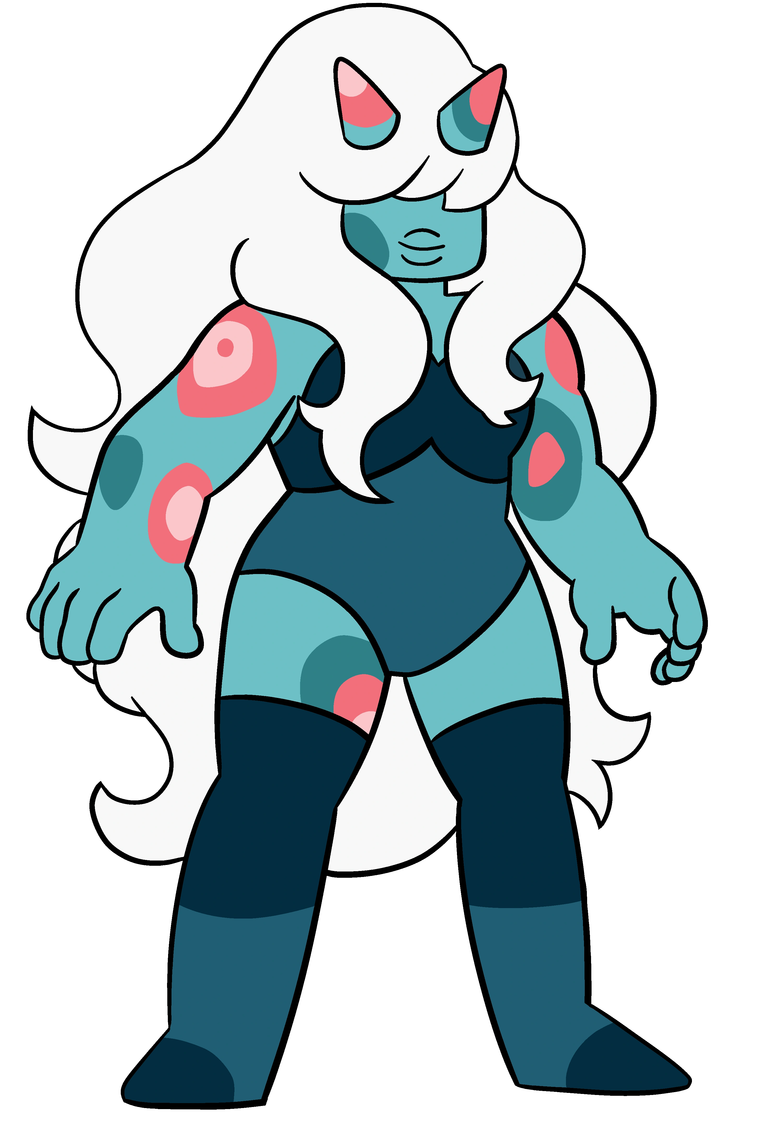 Uncorrupted, this Gem has teal skin and white hair, with coral markings and splotches on her body. She also retains the spikes from her formerly corrupted form. She has a dark teal bra with gray-teal body suit, dark teal cropped leggings, and gray-teal boots with dark teal toe caps.