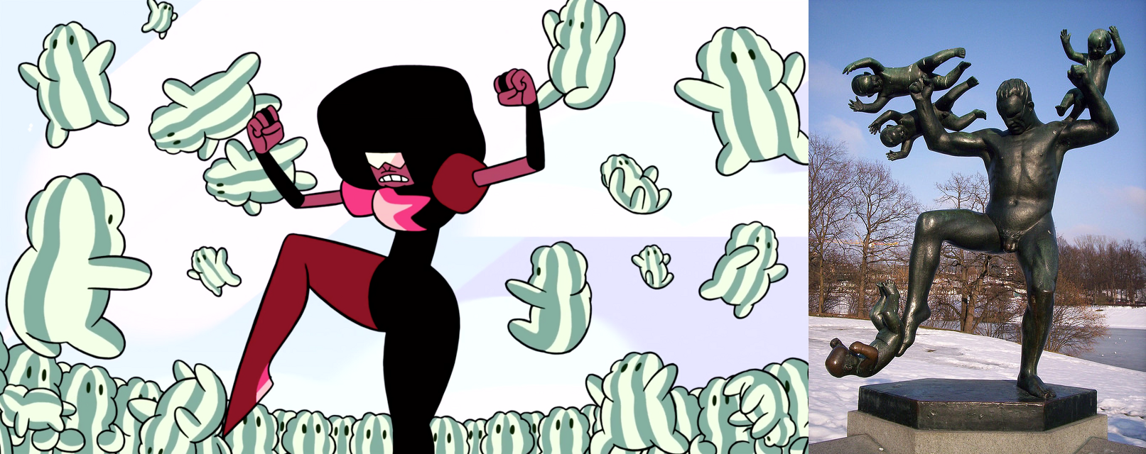 One of the poses Garnet does while fighting the Watermelon Stevens resembles the Frogner Park Babyfighter statue in Oslo, Norway.